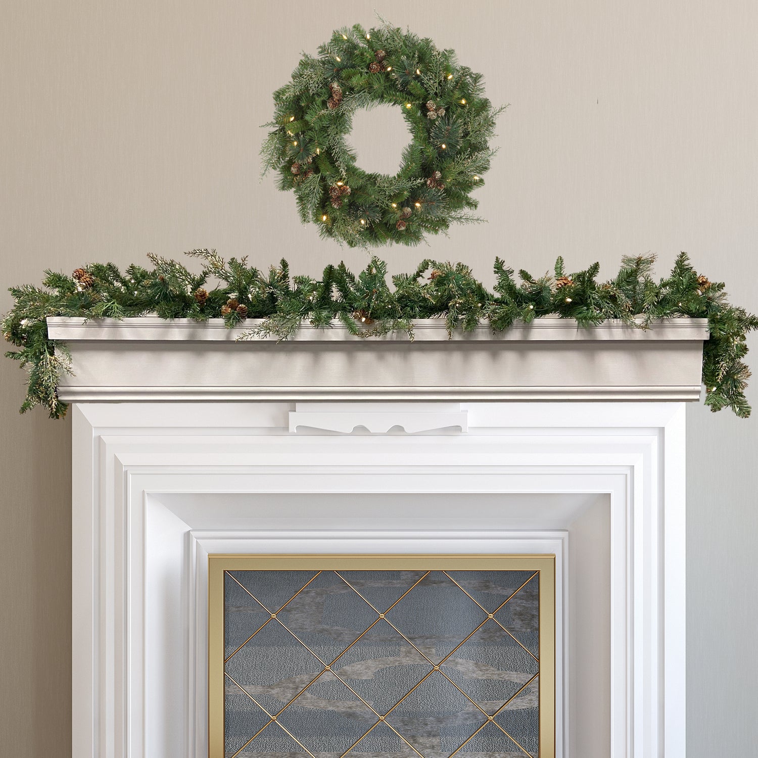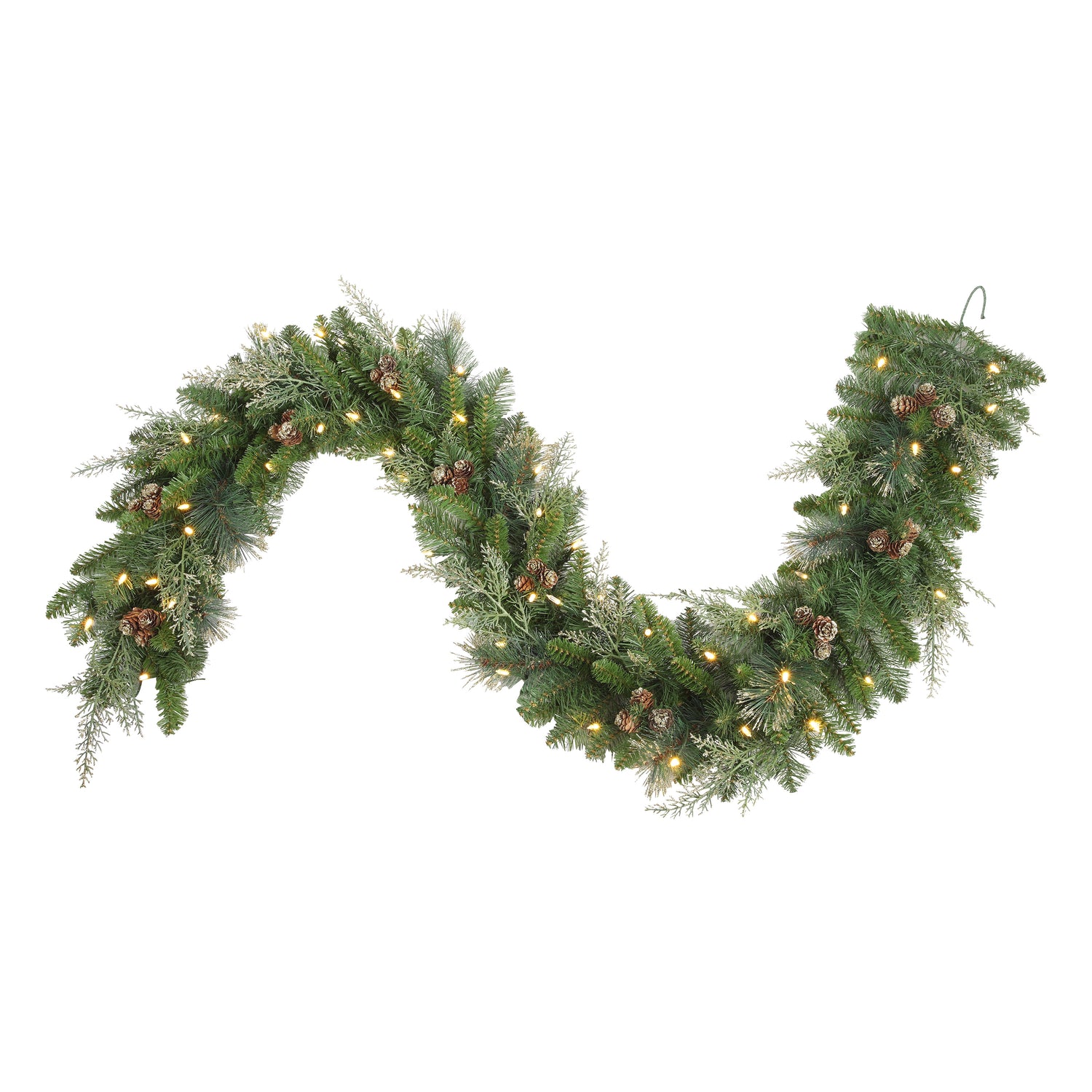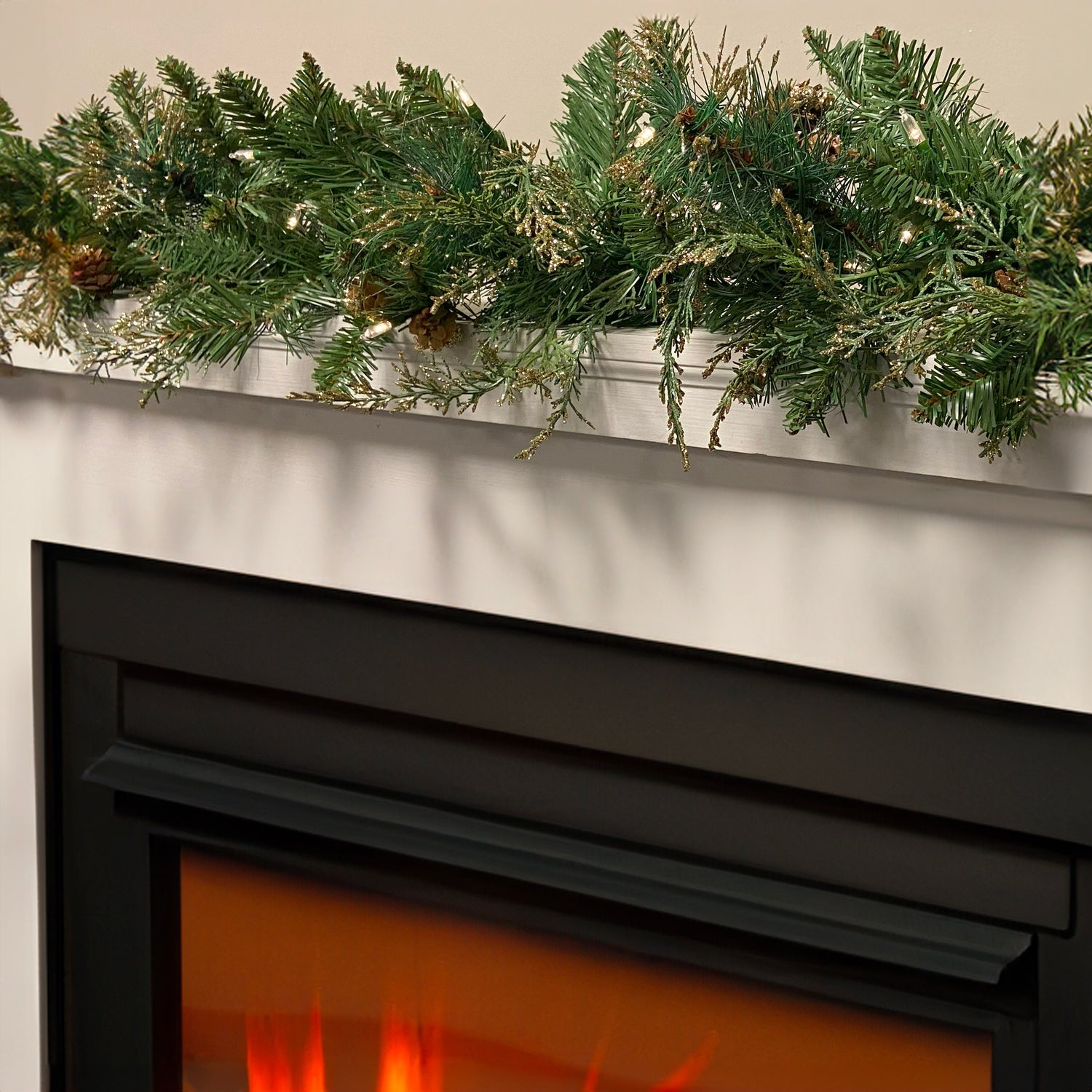 The Bergen Pine collection features lush pine needles and accents of cypress and pinecones with gold glitter for the perfect holiday greenery. The 6 foot long garland comes with 50 soft white battery operated LED lights. Use this natural looking garland on a mantle or even down the center of a dining table - battery operated lights makes it easy! Decorate your doors using several garlands together for a festive look. Pair with the battery operated Bergen wreath over your mantle or on the front door for a complete holiday look.
