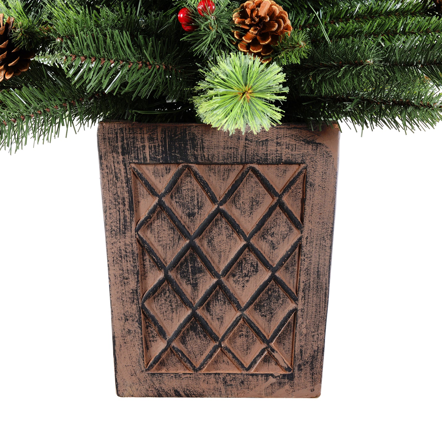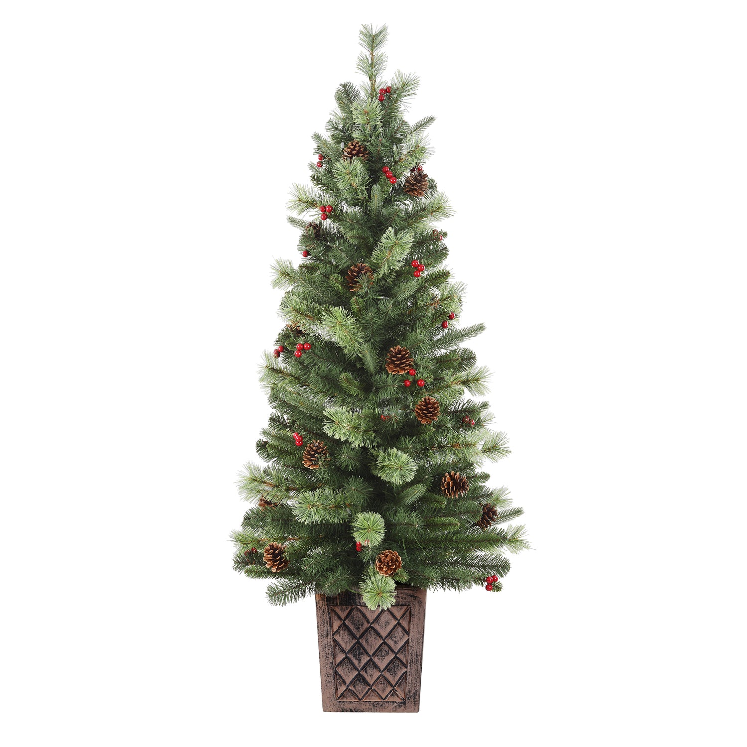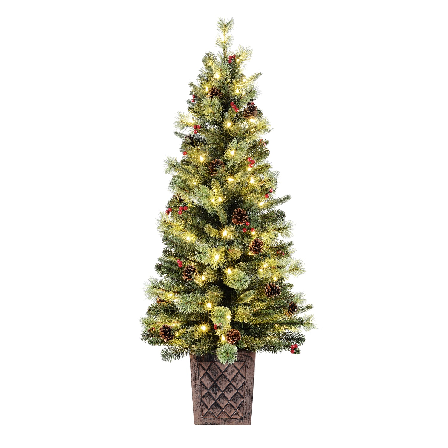 This 4.5 foot tall potted Christmas tree has a beautiful blend of faux fir PVC greenery, cashmere tips, weather-safe red berries, and real pinecones. Suited for indoor or outdoor use, this is a perfect porch Christmas tree. Flank two by the front door, entryway, or fireplace for a regal look or, tuck one in the corner to complete your holiday decor. Pre-strung with 100 warm white LED lights that give off a warm glow. A heavy brown resin planter adds a modern look to this classic Christmas porch tree. For outdoor or indoor use.