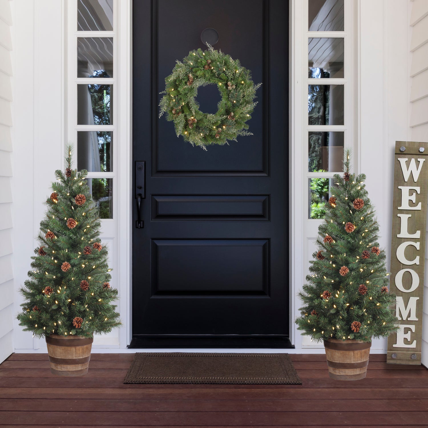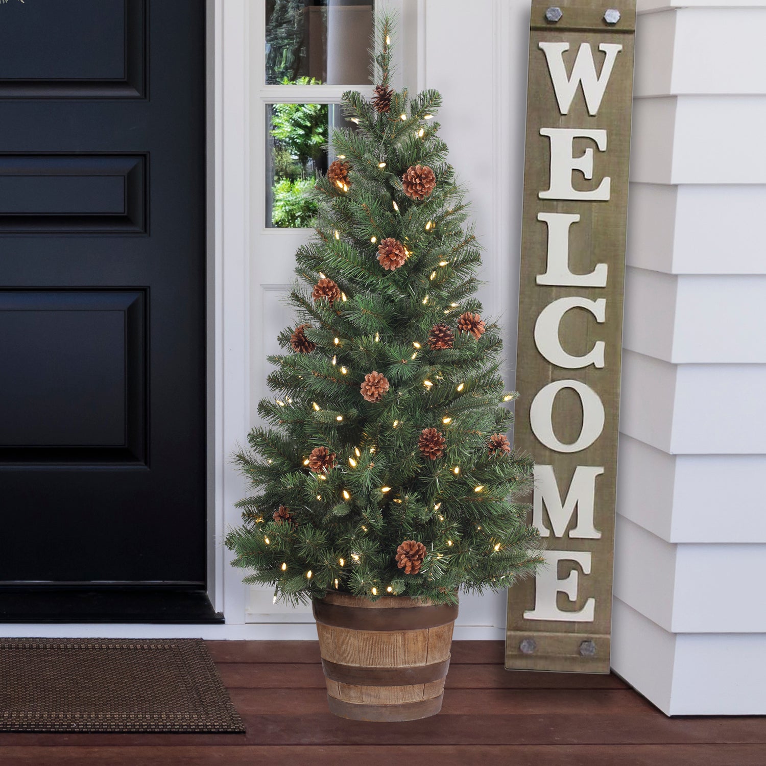 This full 4 feet tall pine tree features a lush mixture of PE, PVC and bristle tips for a lifelike potted tree. The resin pot resembles an aged whiskey barrel - a charming farmhouse or rustic accent. This tree features 12 real pinecones and 150 warm white plug in LED lights. Suited for indoor and covered outdoor use, this tree is the perfect way to dress up your home for the holidays. Use on either side of door in a covered area outside or as a small tree inside - perfect for smaller spaces.