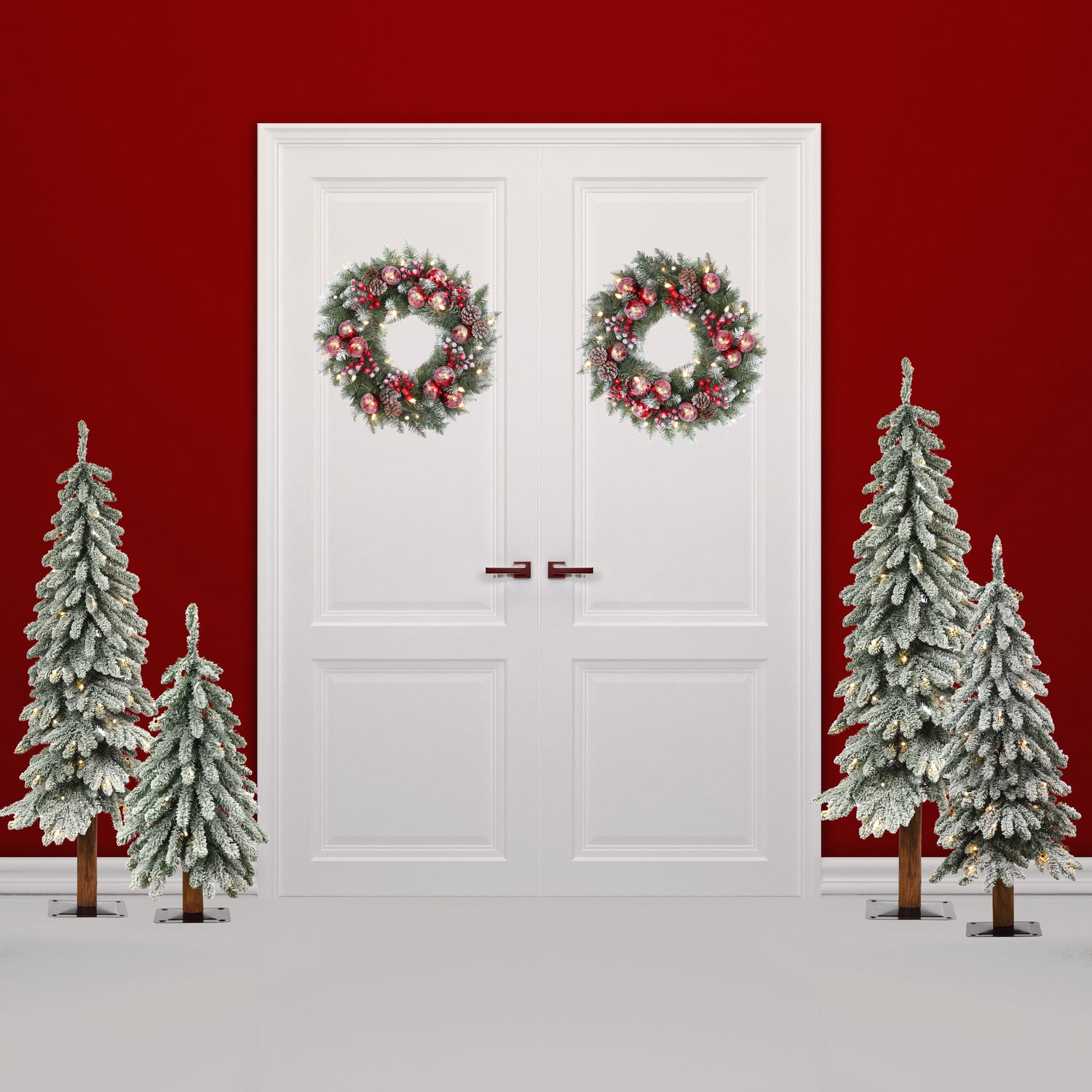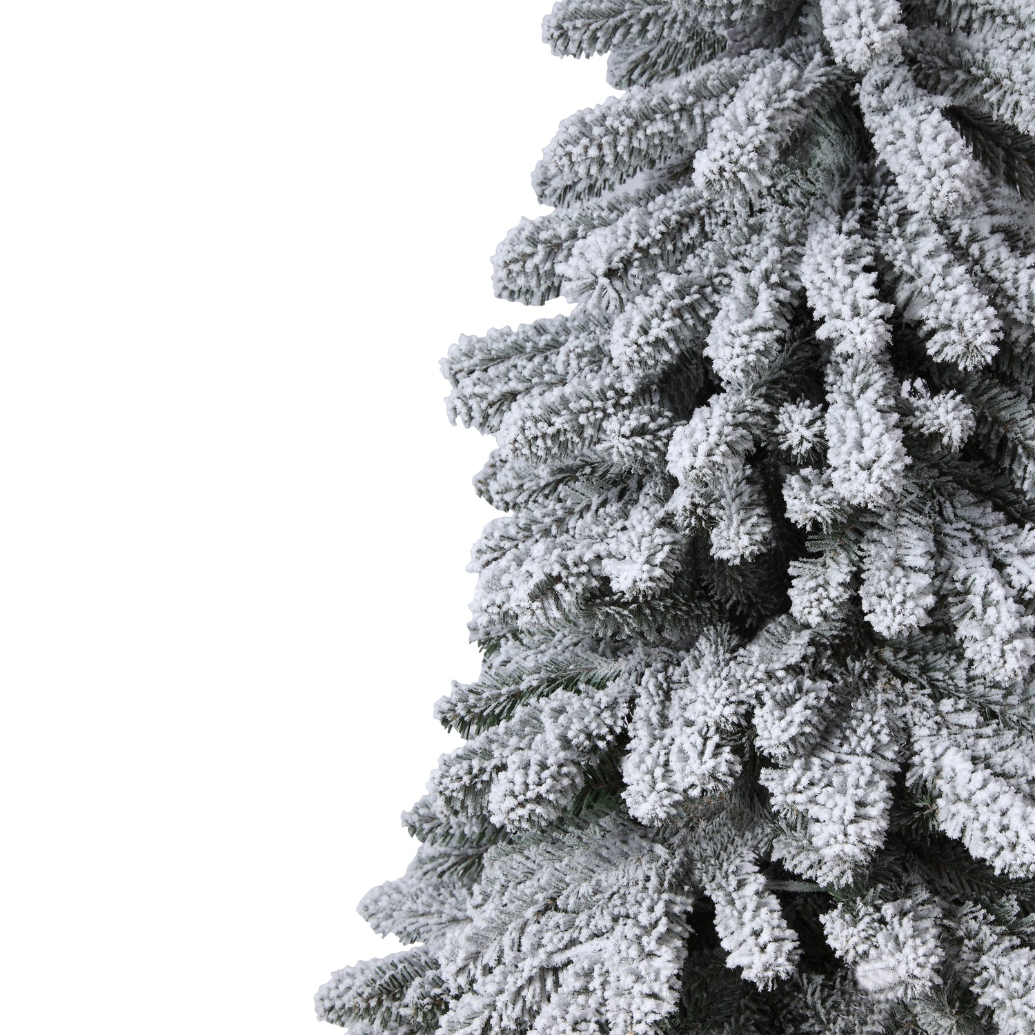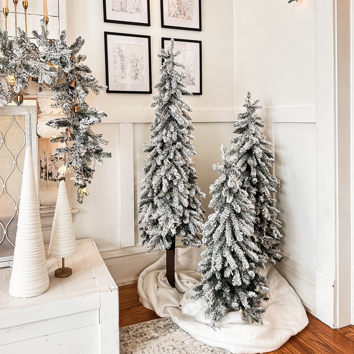 Create a snowy scene with the artificial Flocked Alpine Tree collection. The center poles are solid Paulownia wood, adding to the natural charm of the tree. Based on the Norway Spruce tree, its graceful down-swept silhouette has a light dusting of snow and room between branches for small ornaments if desired. The 5 ft. tree has 100 warm white lights battery operated with built-in timer. Combine with the 2 ft., 3 ft. and 4 ft. sizes and have your own holiday forest in a corner, on a mantle, hearth, or table.