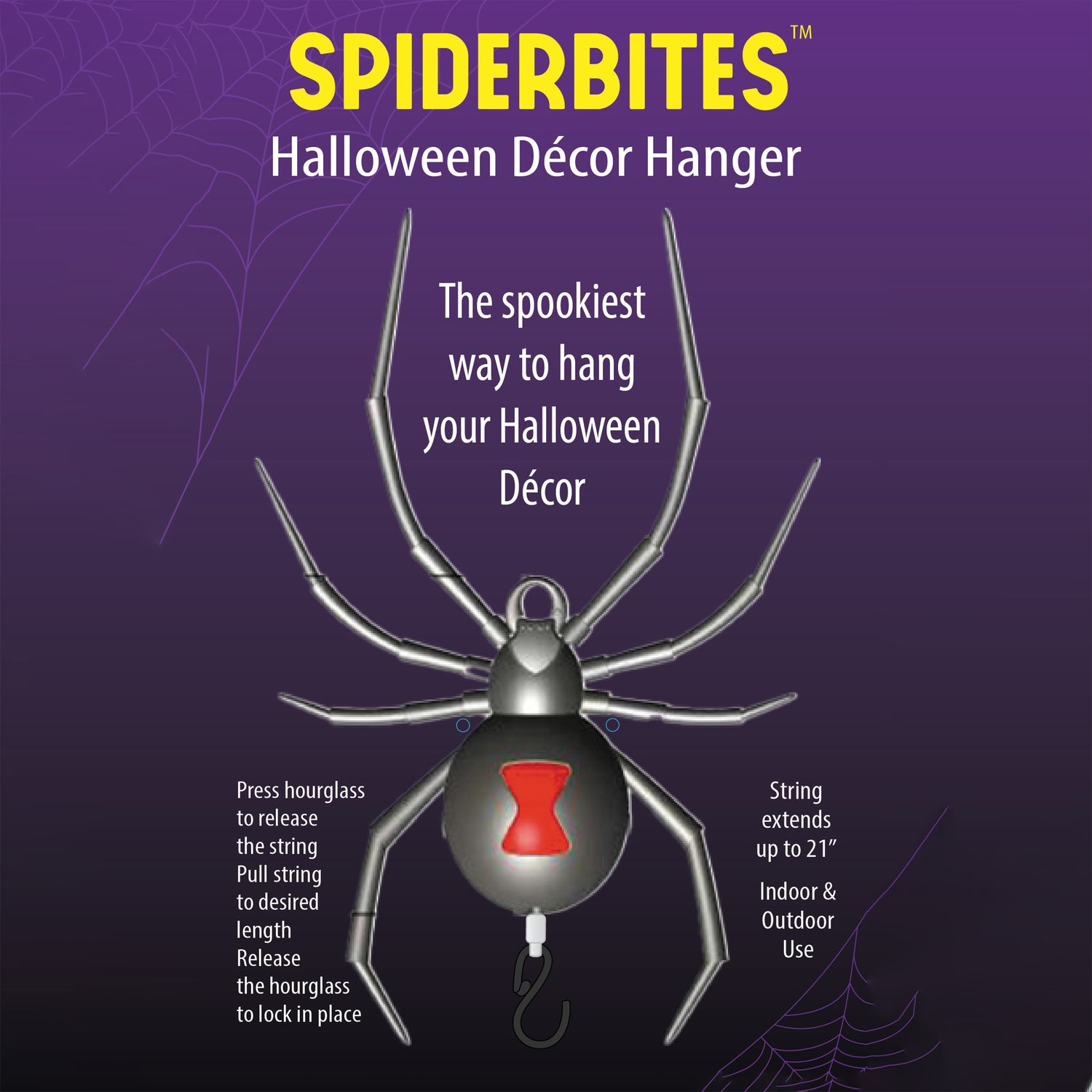 *Free Shipping* SpiderBites™ Halloween Decor Hangers - the spookiest way to hang your Halloween decorations! Just press the hourglass on the spider to release the string, pull it to your desired length (up to 21 inches), and release the button to lock your decorations perfectly in place. Whether you're hanging a ghostly ghoul from a tree branch, a grinning jack-o'-lantern from your porch, or the spider as its own decoration, SpiderBites makes decorating a treat, not a trick. Patent Pending. Not a toy. SpiderBites Halloween Decor Hangers are not intended for use by children.