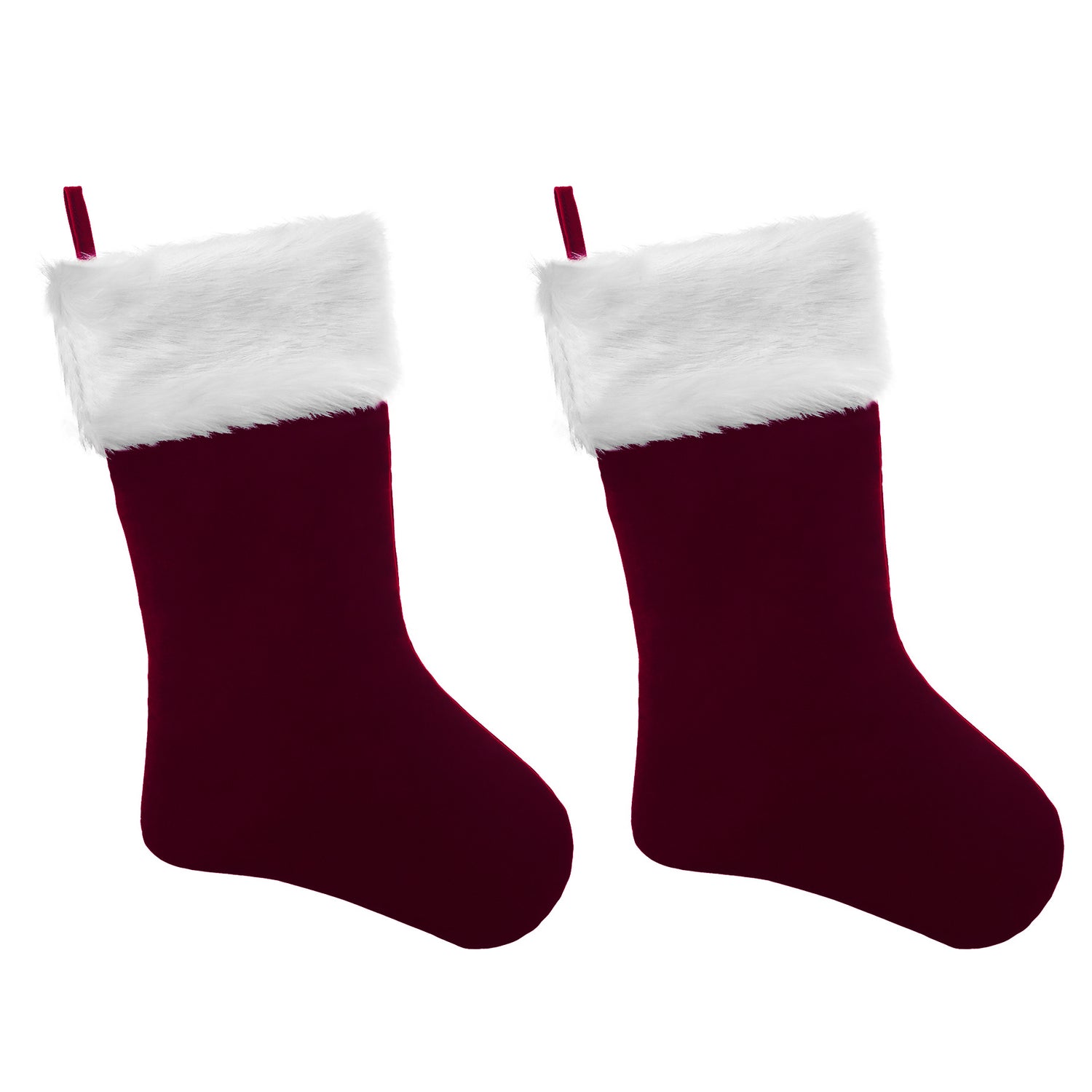 The Premium Classic HangRight Christmas Stocking is the perfect solution to crooked stockings hanging from the fireplace. Regular stockings tend to twist and turn as they hang from the fireplace mantel but the HangRight Stocking is made to hang straight every time! The patented design allows the loop to turn a full 360 degrees which allows you to adjust the direction the stocking hangs every time! Available in packs of 1, 2 or 4 and in a variety of designs. Measures approximately 20 inches long with a 5-inch opening at the top. Made of polyester fabric that can be cleaned with a damp cloth. Color is a beautiful dark red / burgundy with furry white cuff.