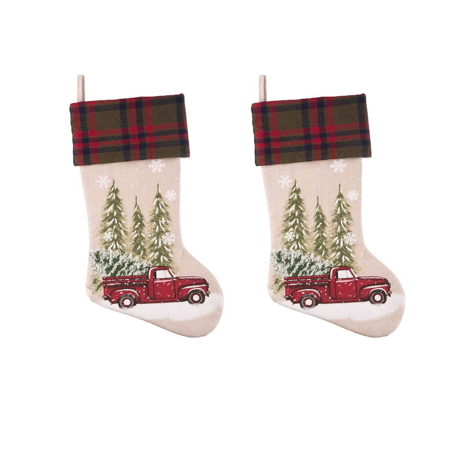 - BEAUTIFUL: The Nostalgia stocking is made of a polyester blend (65% polyester/35% polypropylene) fabric that features a printed Christmas design on the front side of the stocking, felt liner and a wrap-around plaid flannel cuff. Each stocking measures approximately 20 inches long with a 5-inch opening at the top.