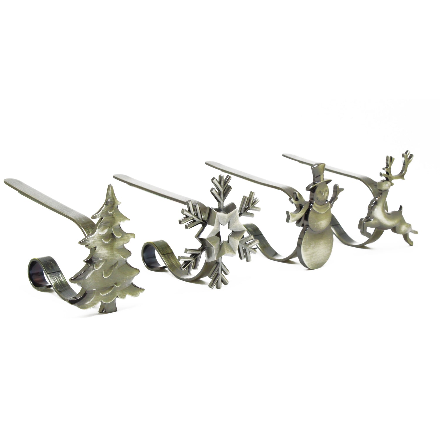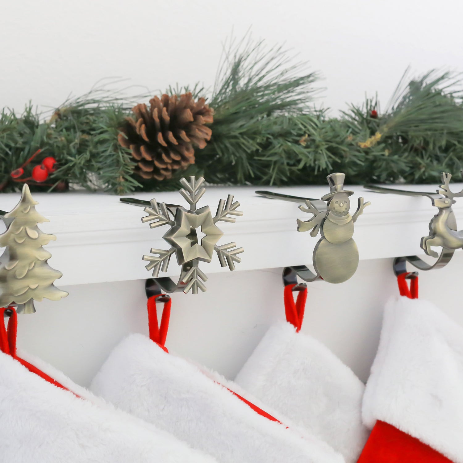 The Original MantleClip Stocking Holder with Removable Metal Holiday Icons, 4 Pack - Assorted Antique Brass