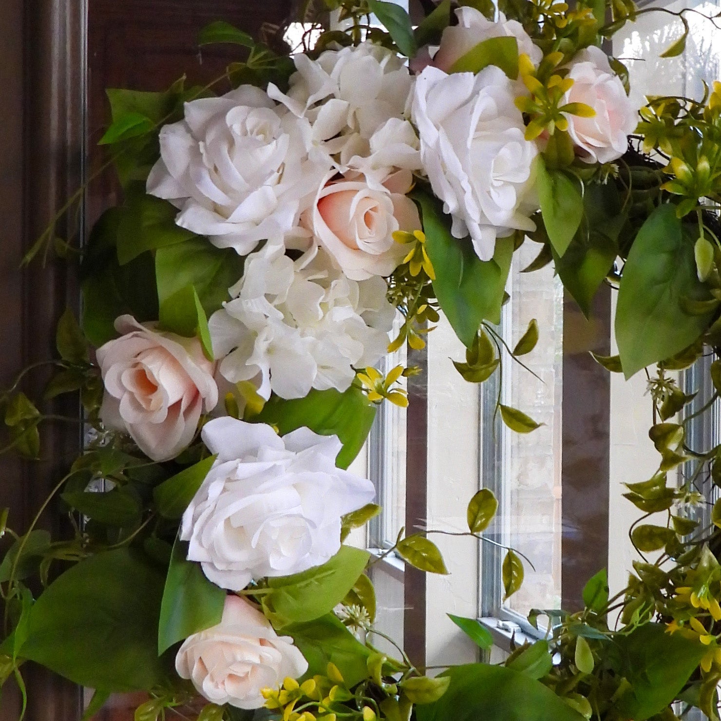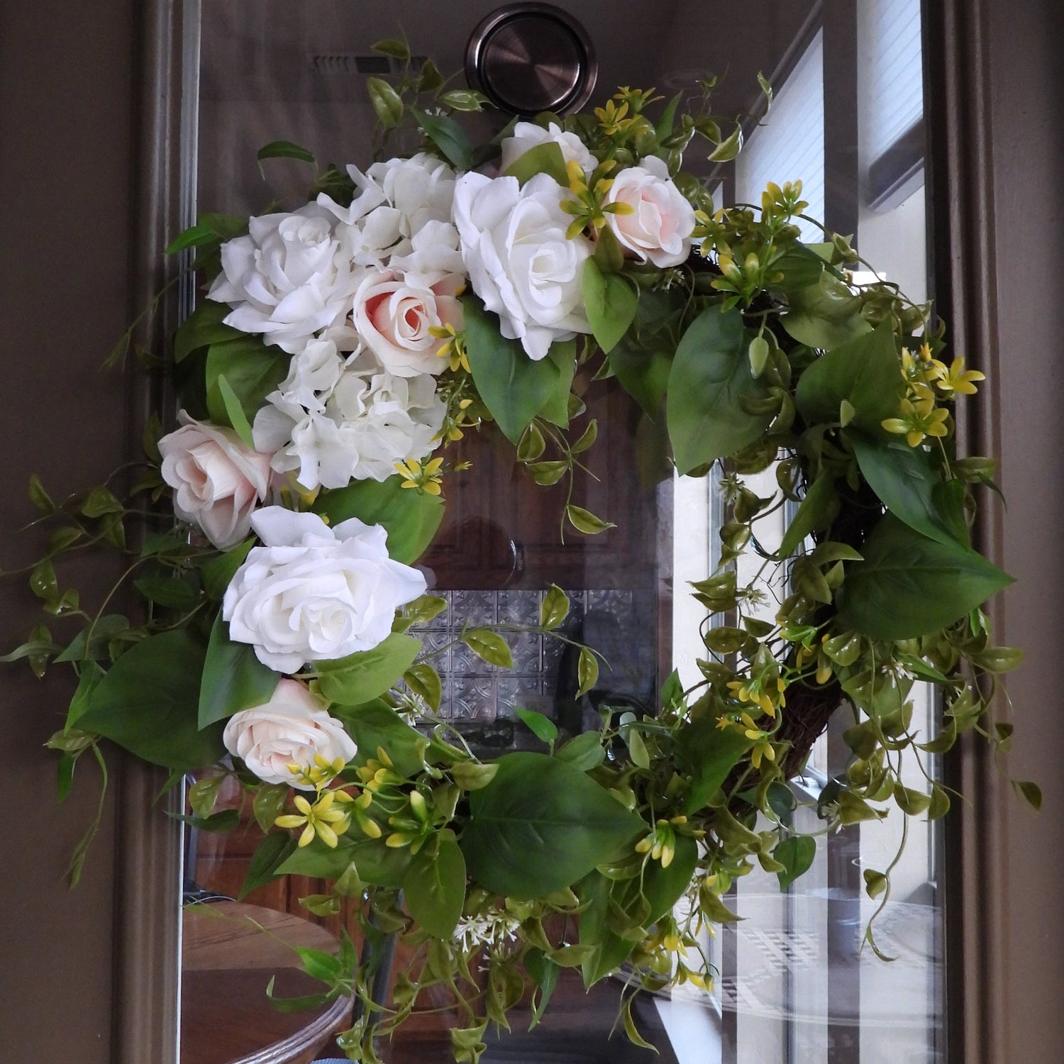 A lovely wreath for rose-lovers. This wreath features a mix of white and pink roses, white hydrangeas, and is made with a grapevine base that features a loop for easy placement. For indoor or outdoor use.