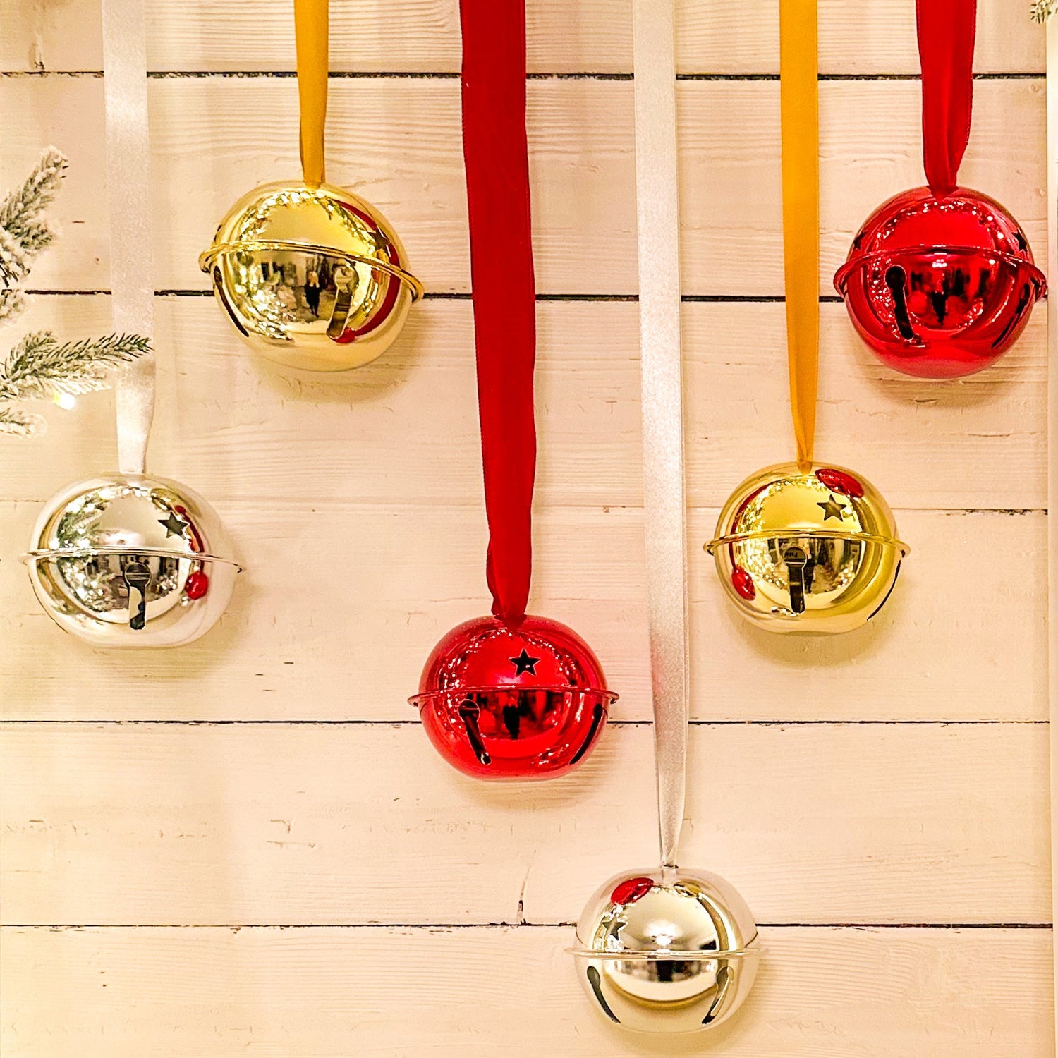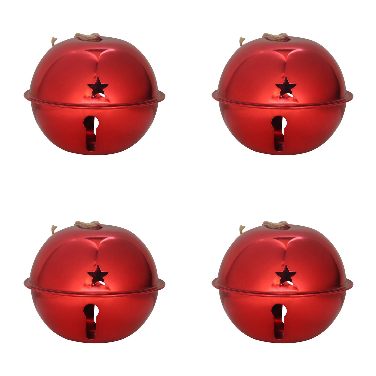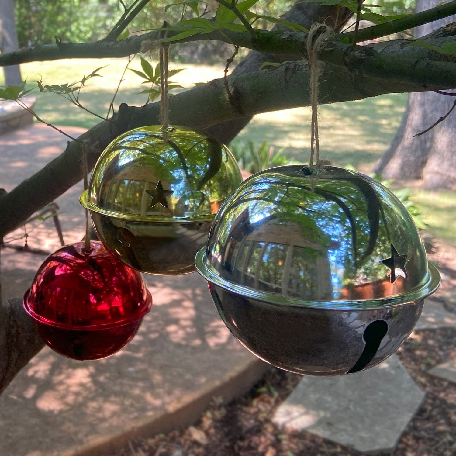 Add some shiny joy to your holiday season with these extra large jingle bell ornaments. They twist open so you can hide a present inside, or simply store them compactly after the season. Hang them on your Christmas trees indoors or outdoors. Available in shiny gold, silver, and red colors, they are sure to create smiles. Each bell measures 120mm (4.7 inches) diameter, and includes a jingle bell clapper for authentic jingle bell sound. String attached for easy hanging and are suitable for use inside or outside use. Single color comes 4 bells per pack. Mix of 3 colors in pack of 6. Tops and bottoms of bells are interchangeable so you can create combination color bells. Bells twist open and nest for compact storage. Patent pending.