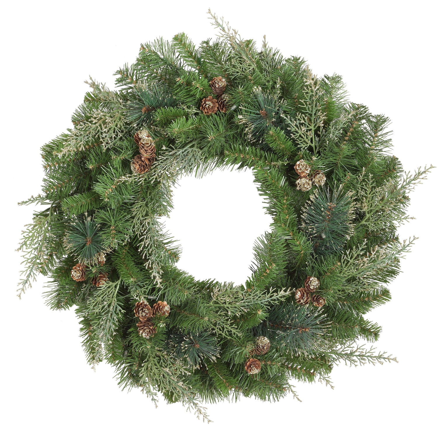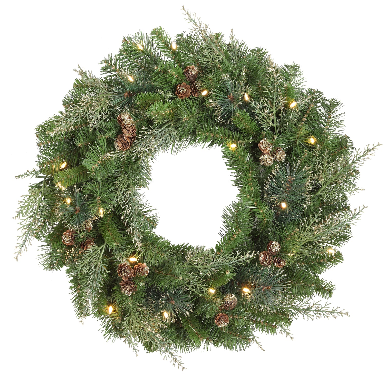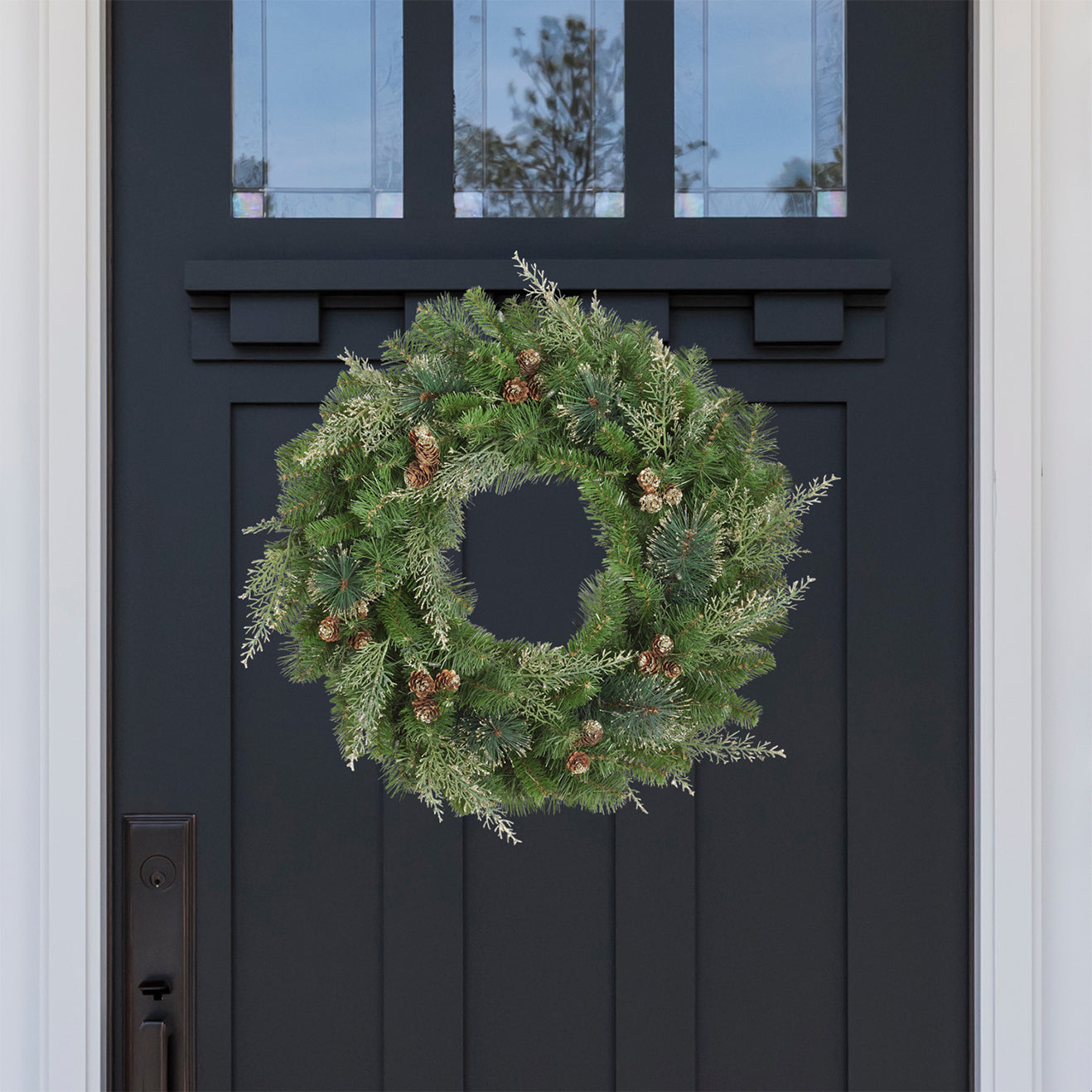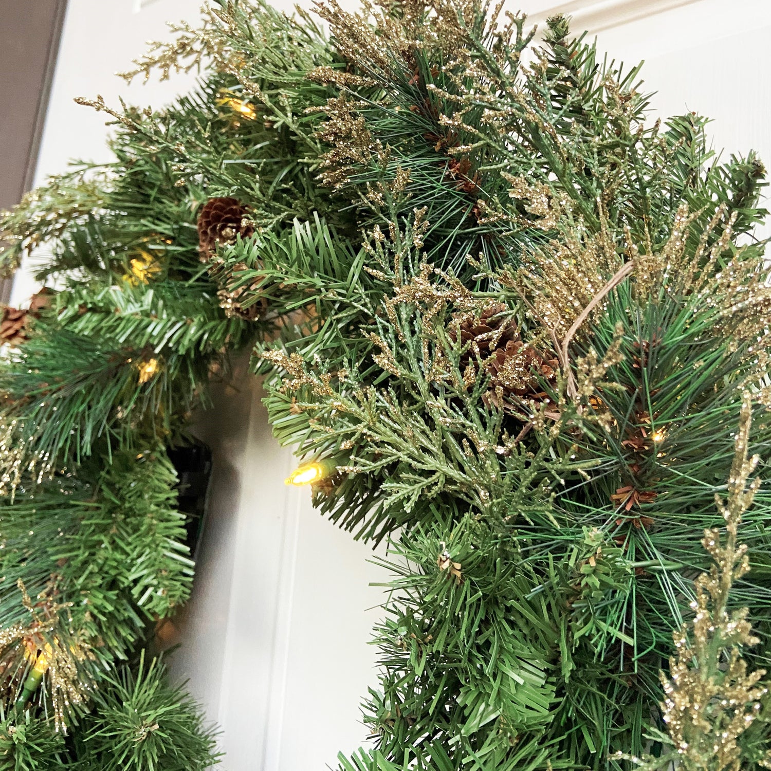 • Natural looking artificial Christmas wreath features 112 tips, cypress sprigs, gold accents, real pinecones, and 30 soft white battery operated T5 LED lights