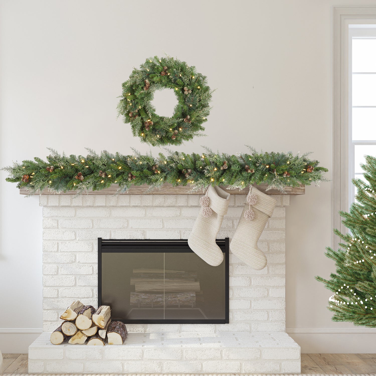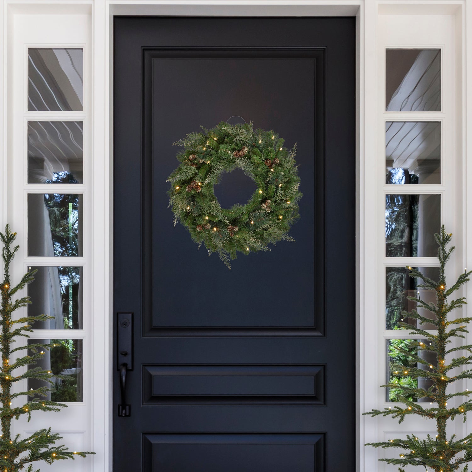 The Bergen Pine collection features lush pine needles and accents of cypress and pinecones with gold glitter for the perfect holiday greenery. The 24 inch wreath is the perfect size for over your mantle or on a door and easy to do with the battery operated lights - no cords! The timer mode will make sure your wreath lights up every day at the same time. Pair with the battery operated Bergen Pine garland for a complete holiday look.