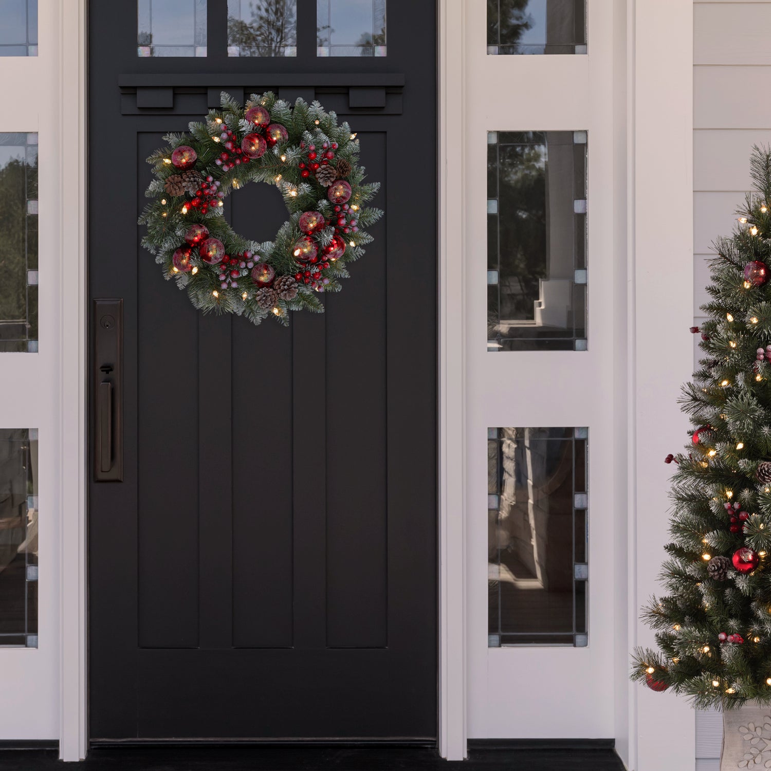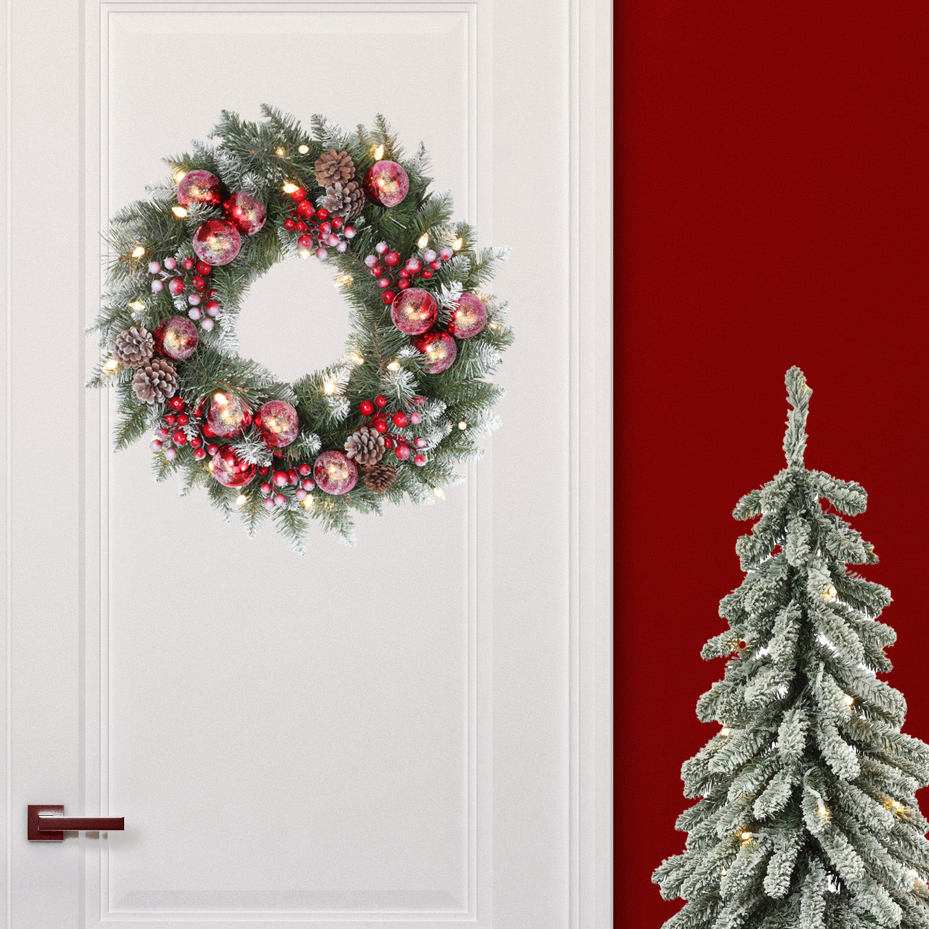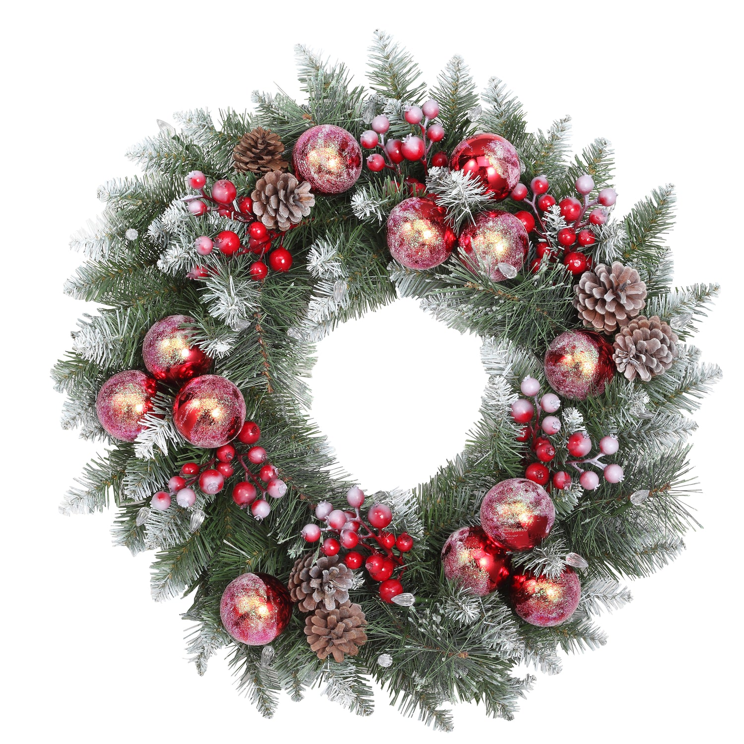 • Christmas wreath features 98 tips, 30 soft white battery operated C3 LED lights, light frosting, pinecones, red berries, and red shatterproof balls