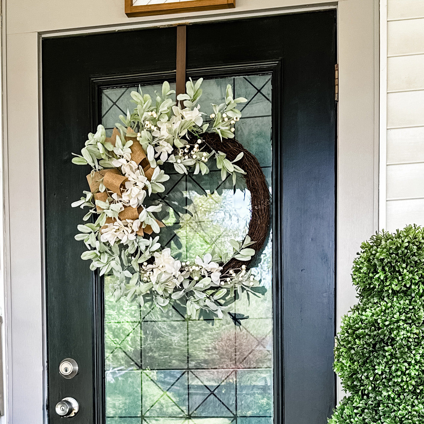 Our best-selling hydrangea wreath now offered in a bigger size! This wreath features a mix of artificial cream hydrangea flowers, lamb ear, white berries, and a burlap bow making it the most beautiful front door accent. The 28 inch version makes this the perfect statement wreath! After removing your wreath from its box, be sure to extend and shape the foliage in order to achieve the desired size and look.