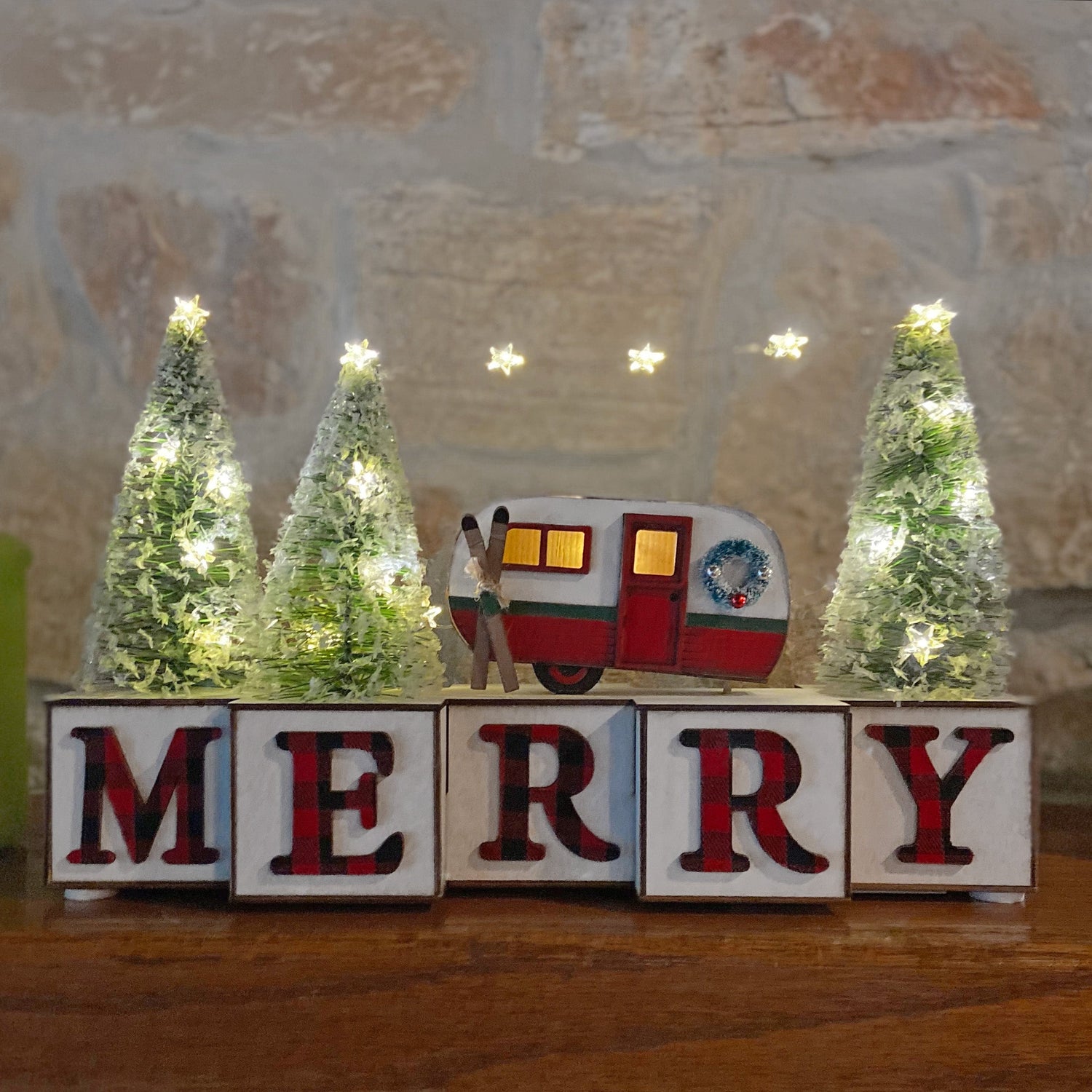 Our whimsical camper will add a festive touch to your Christmas decor with these wood Christmas blocks. Decked out for the holidays with a wreath and skis, these blocks are made from MDF wood and decorated with bristle trees, festive wood MERRY lettering in buffalo check; the perfect fun accent in any room. The trees are pre-lit with 20 warm-white microwire lights. Battery operated with a built-in timer function that runs 5 hours on and 19 hours off. Indoor use only. Measures 15 inches Long x 4 inches Deep x 9.5 inches High.