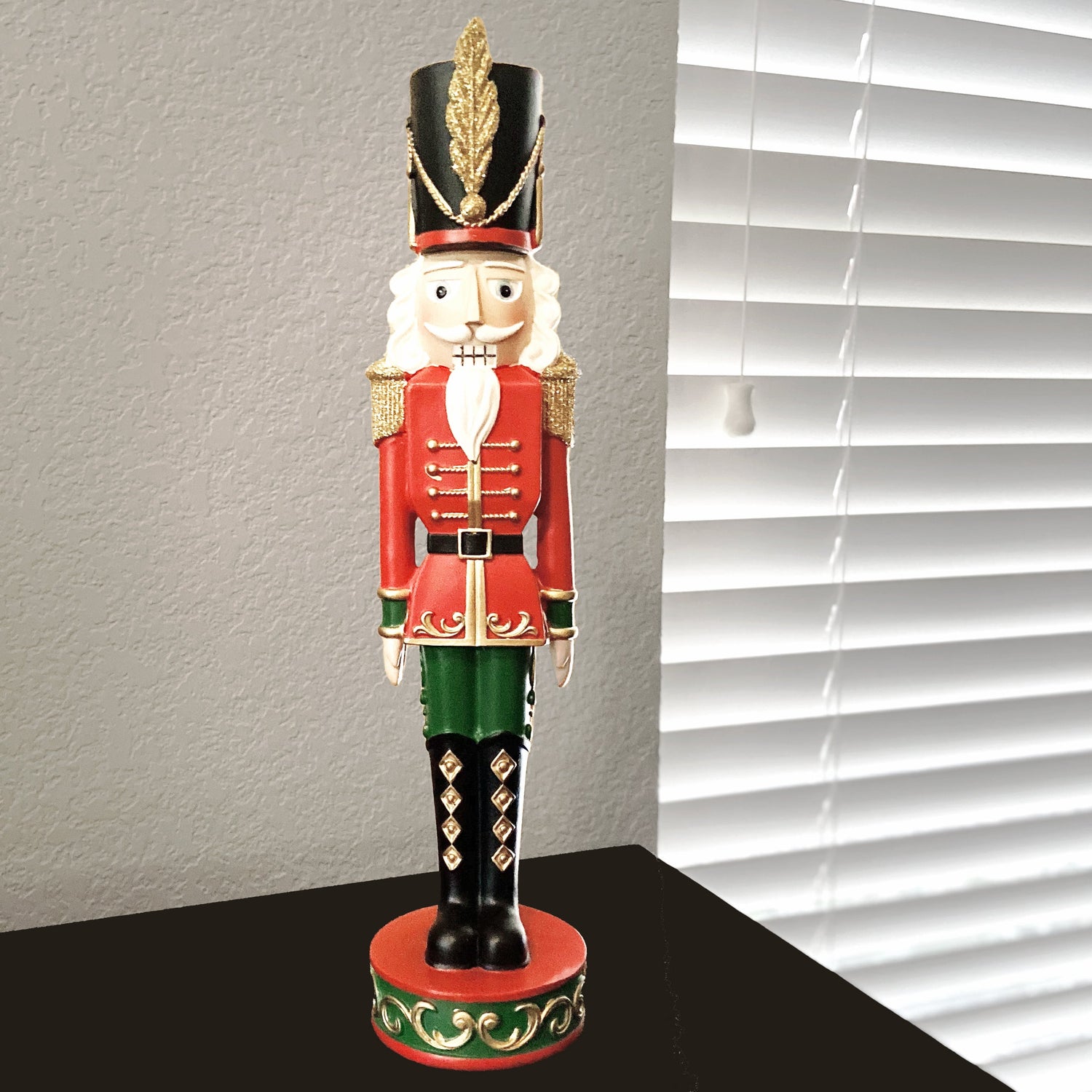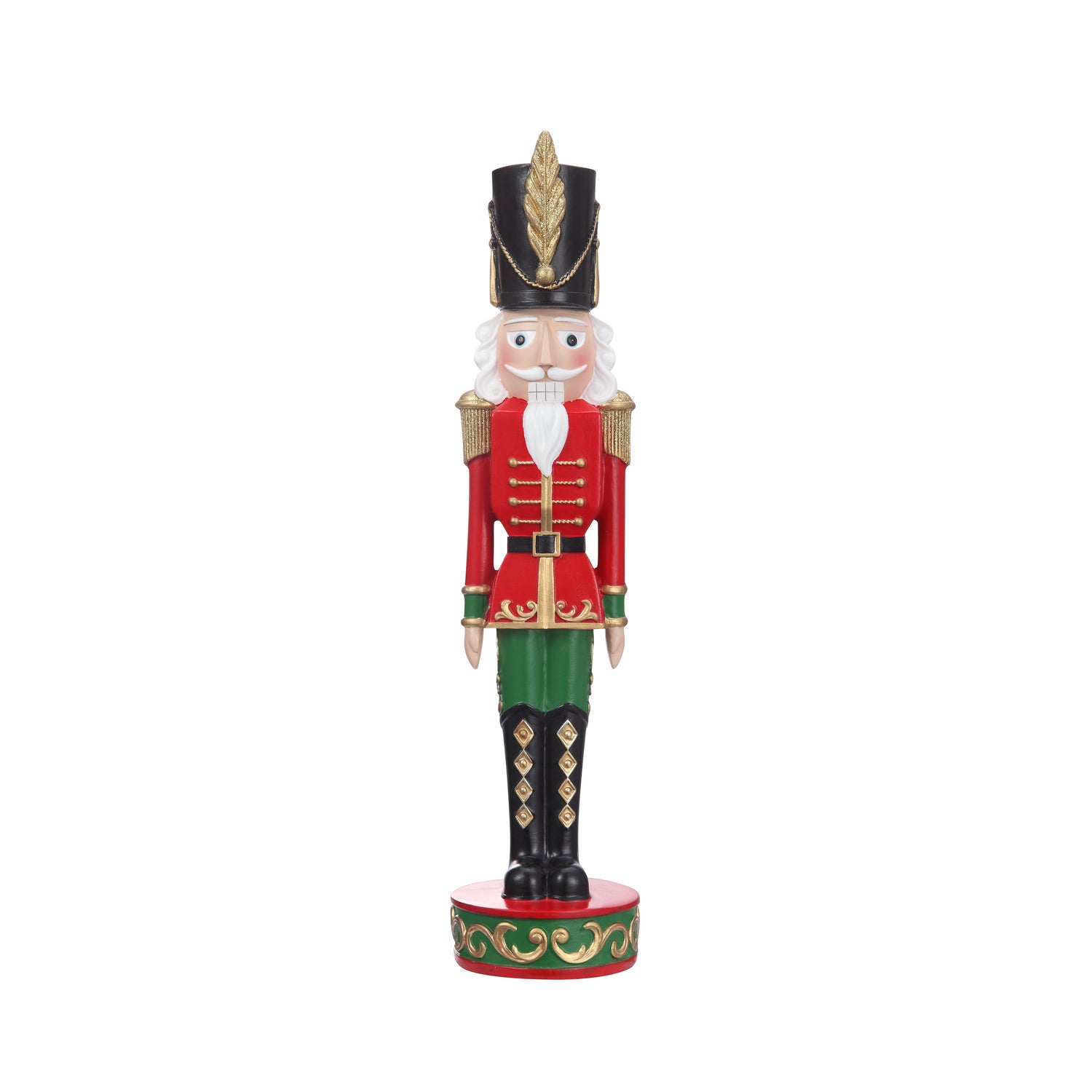 Our classic red and green Christmas nutcracker is now available in a smaller tabletop and mantel size. This Christmas nutcracker is the perfect addition to any festive holiday scene. This three-dimensional nutcracker features red, green and gold coloration with glitter accents. We recommended pairing two or more together for a regal look on your holiday table or mantel. Also makes a great gift. Measures 12.75 inches tall, and weighs 1 pound. This traditional Christmas nutcracker soldier is constructed of solid resin and has a hand-painted finish. For decoration only - no moving parts.