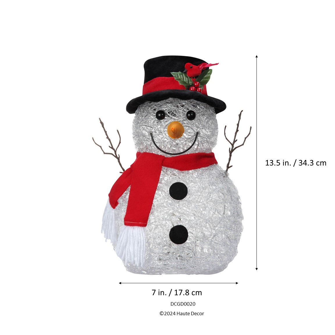 Welcome this happy snowman into your home for a cheery holiday display. He is 13 inches tall and made from spun acrylic with battery operated LED lights inside. He is perfect for a mantel, dining table, kitchen island, bedroom or bathroom - anywhere you want some seasonal flair. He has a timer function of 5 hours on and 19 hours off, so you don't have worry about turning it on each day. When switched to "ON" timer is automatically activated.