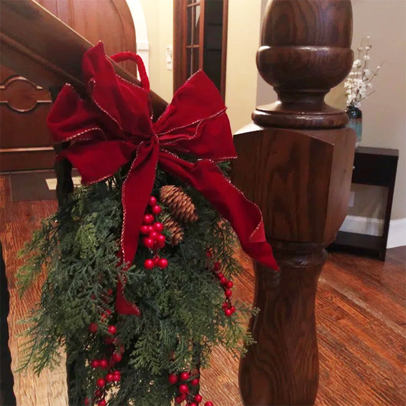 Add a beautiful Christmas swag to the back of any chair. This chair back swag features an assortment of PE/PVC lush, mixed greenery, faux berries, and real pinecones. Pre-lit with 15 warm white LED lights, this swag has a countdown timer function that runs 6 hours on and 18 hours off. The PE/PVC mixed greenery (45% PVC/ 10% PE) blend features 31 tips and comes with a velvet-covered hook for easy hanging on either the back of a chair or staircase railing. A beautiful weather-safe dark red velvet bow is the finishing touch to this Chairback Swag. Requires 3 AA batteries - not included. Perfect for indoor and outdoor use, Measures 14 inches Wide x 4 inches Deep x 20 inches High. Weighs 1 lb.