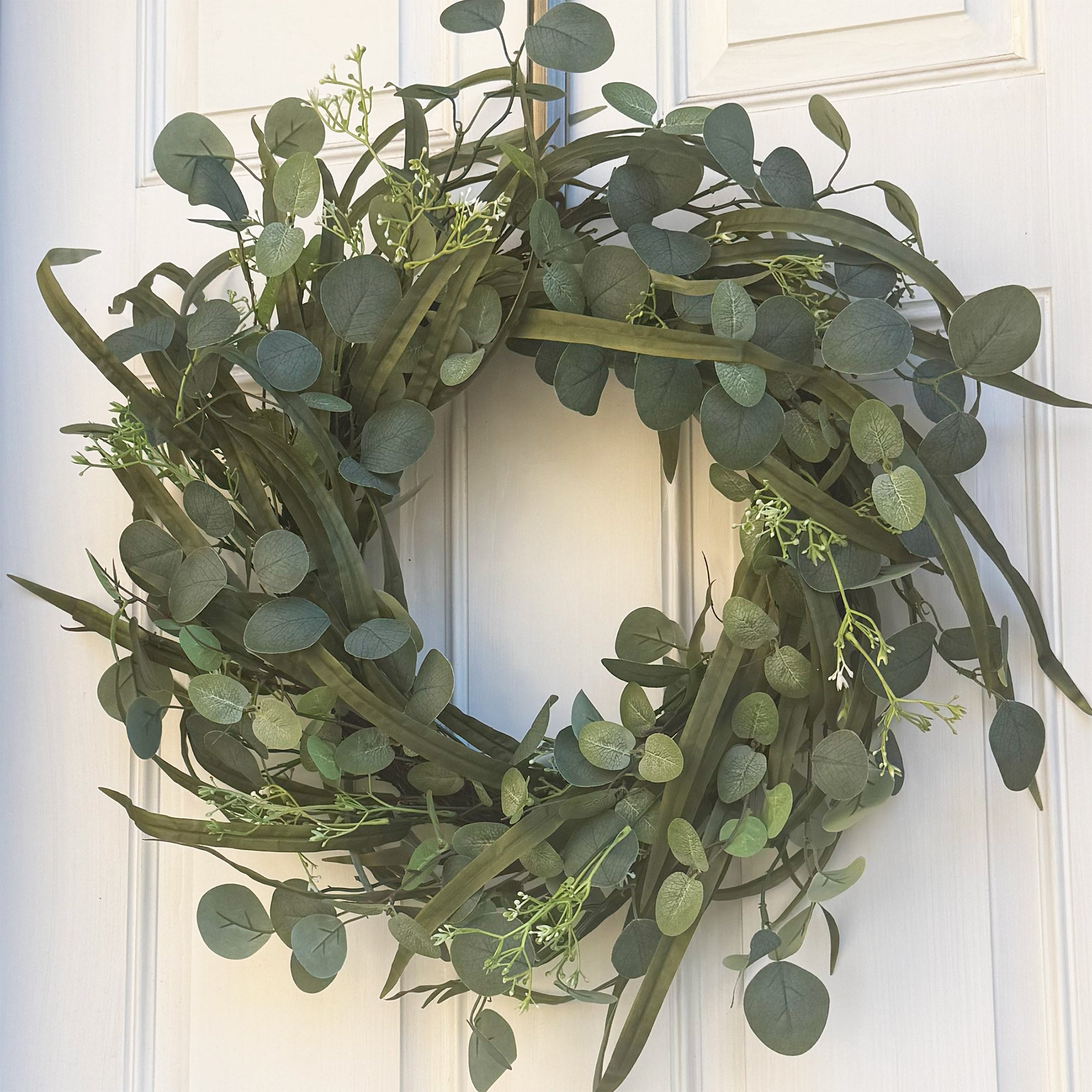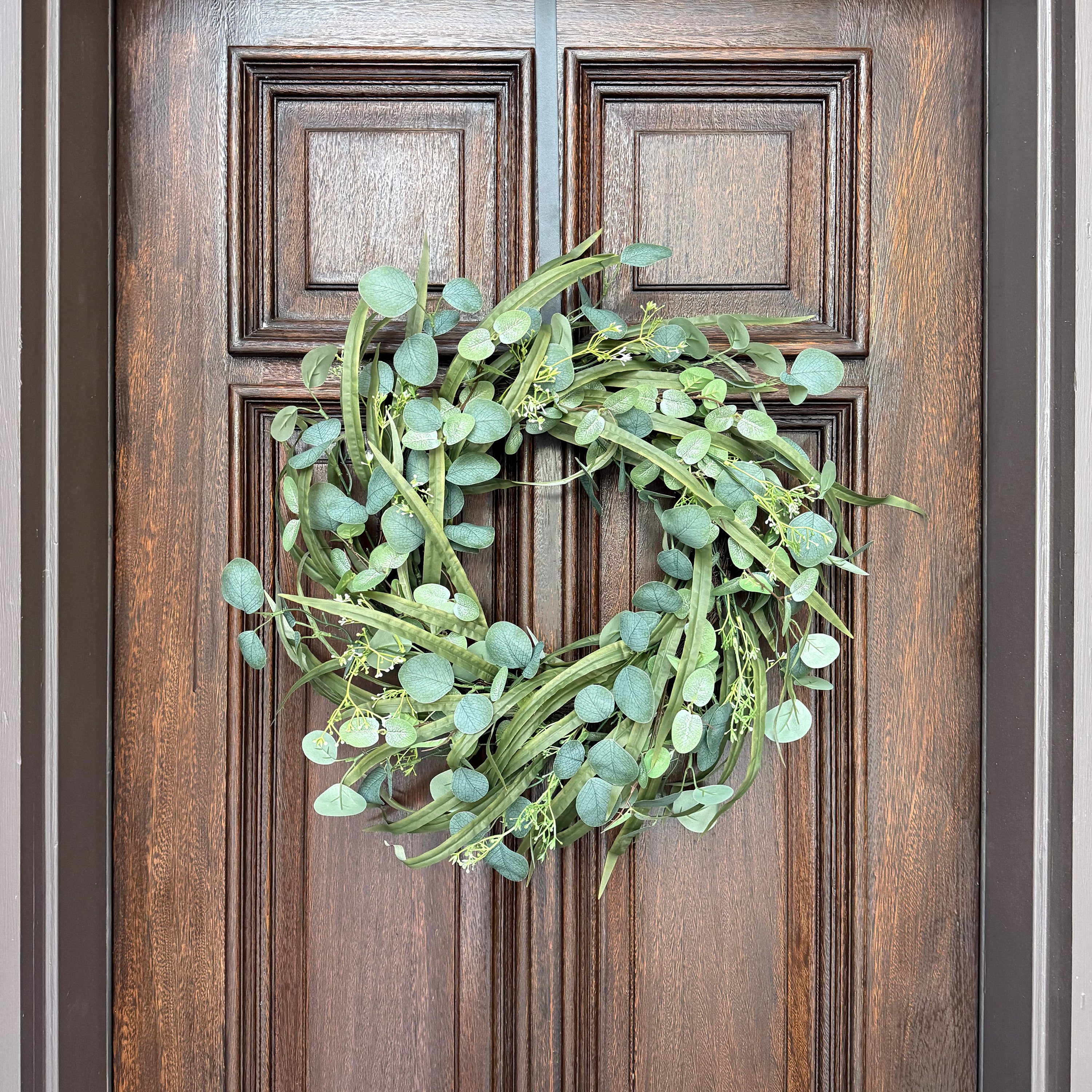 Refresh your entryway for spring or summer with a touch of timeless greenery. This 24-inch Eucalyptus wreath captures the essence of nature with its varied shades of sage and forest green. The perfect multi-season solution for your front door. Its neutral green color makes it an ideal spring, summer and fall wreath. The perfect sized wreath for standard sized front doors. Foliage measures a full 24 inches diameter, the inner natural grapevine base measures 14 inches diameter, and the wreath measures 6 inches deep.