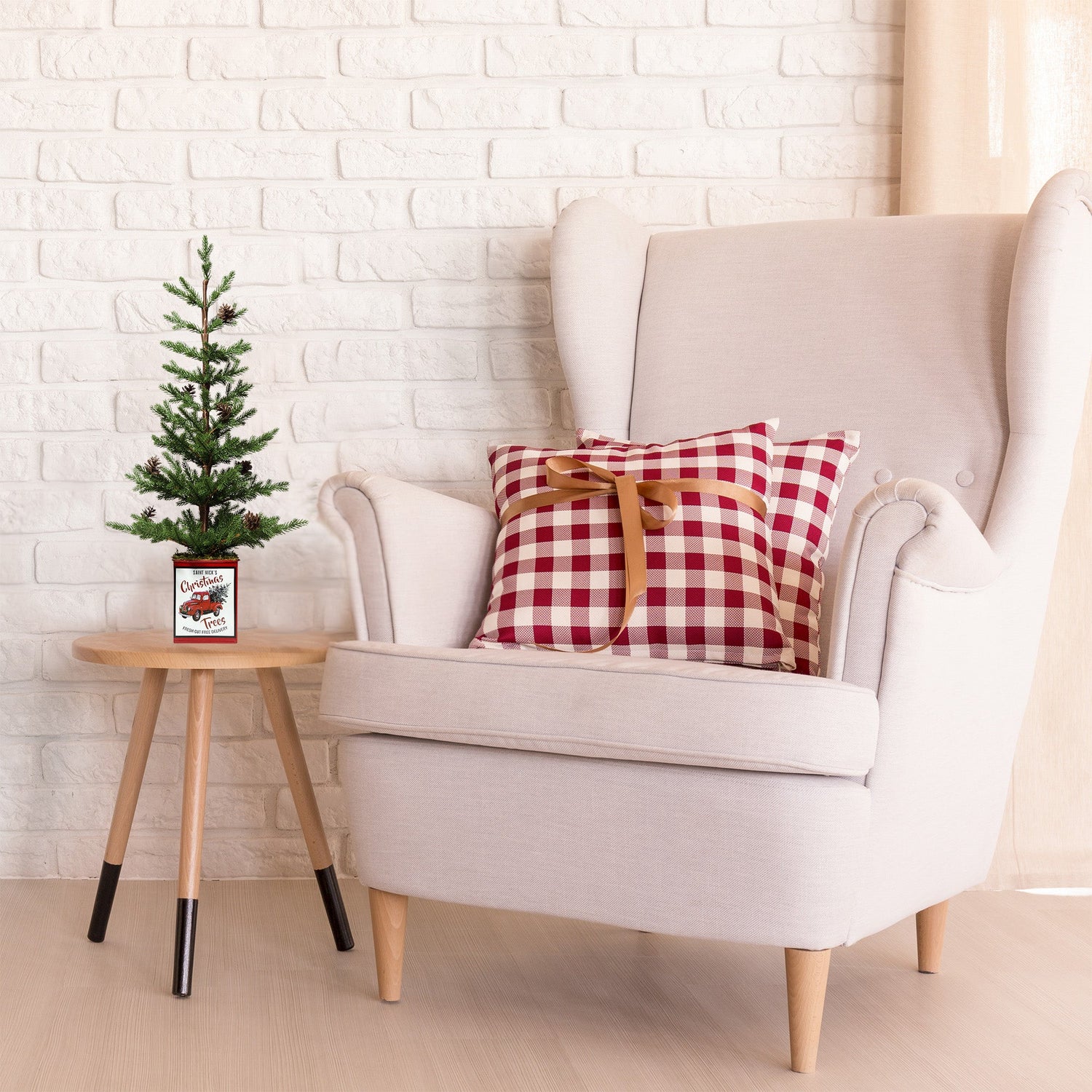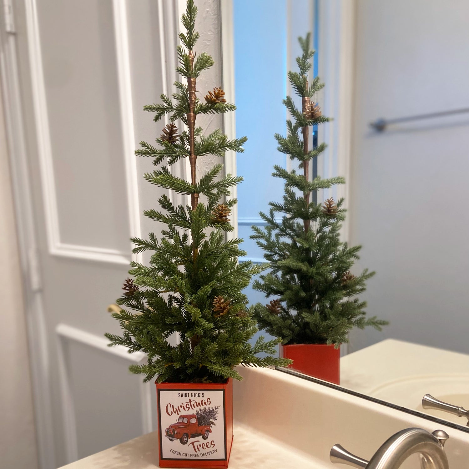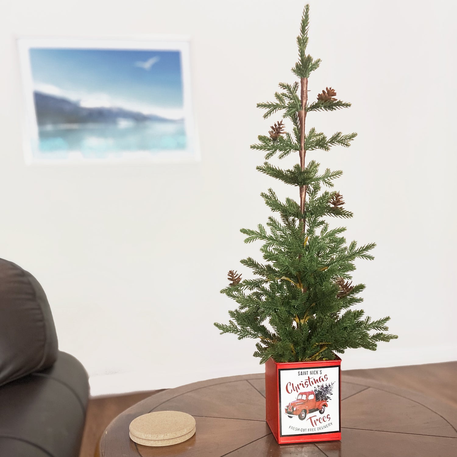 Shaped just like a fresh cut fir tree, our 24-inch tree with real pinecones in a decorated metal pot, is the perfect holiday decor. The classic red truck carrying a freshly-cut Christmas tree design on the metal pot will surely delight Use it in pairs on a mantel, hearth or end tables. It is the perfect size for small spaces that need a little Christmas cheer like a child's bedroom or office. The tree is made of PVC and PE, giving you years of enjoyment.