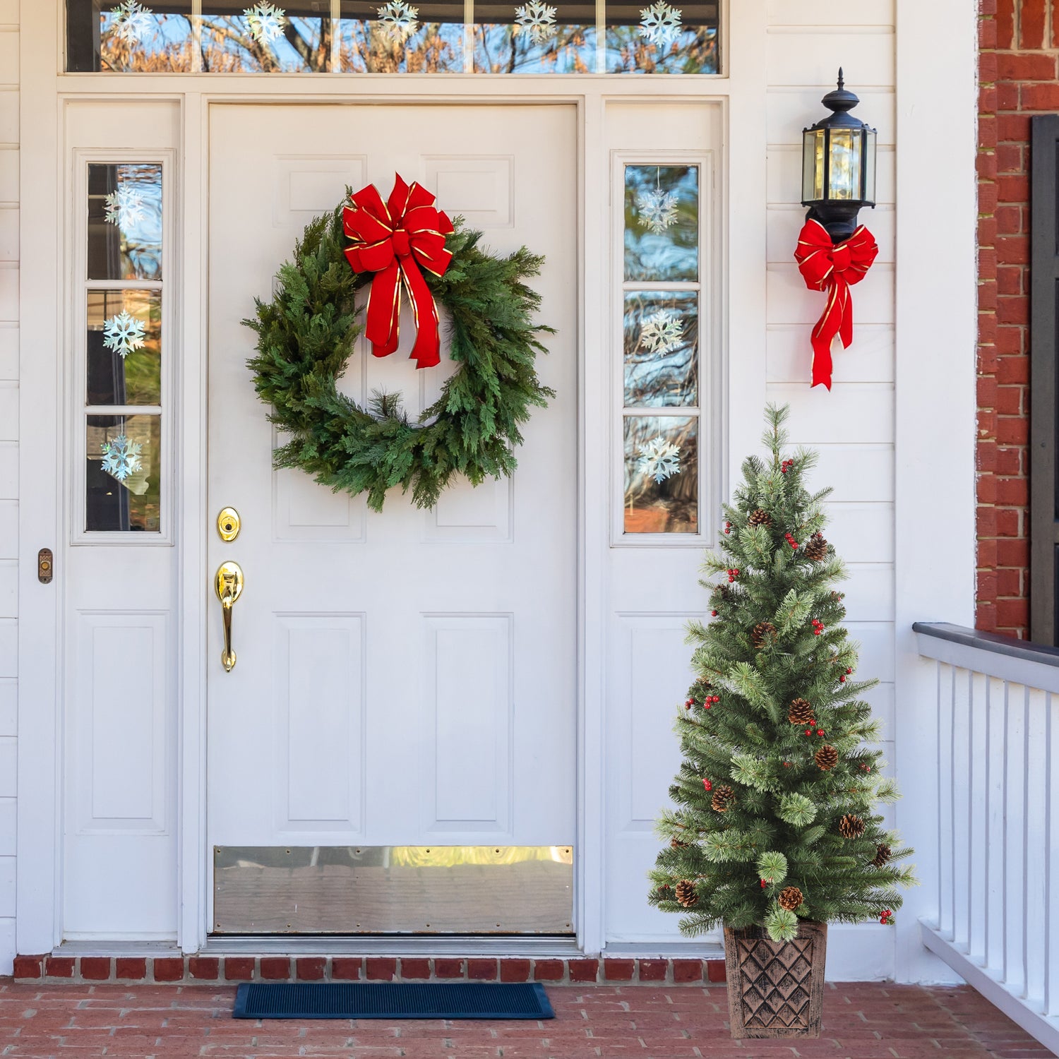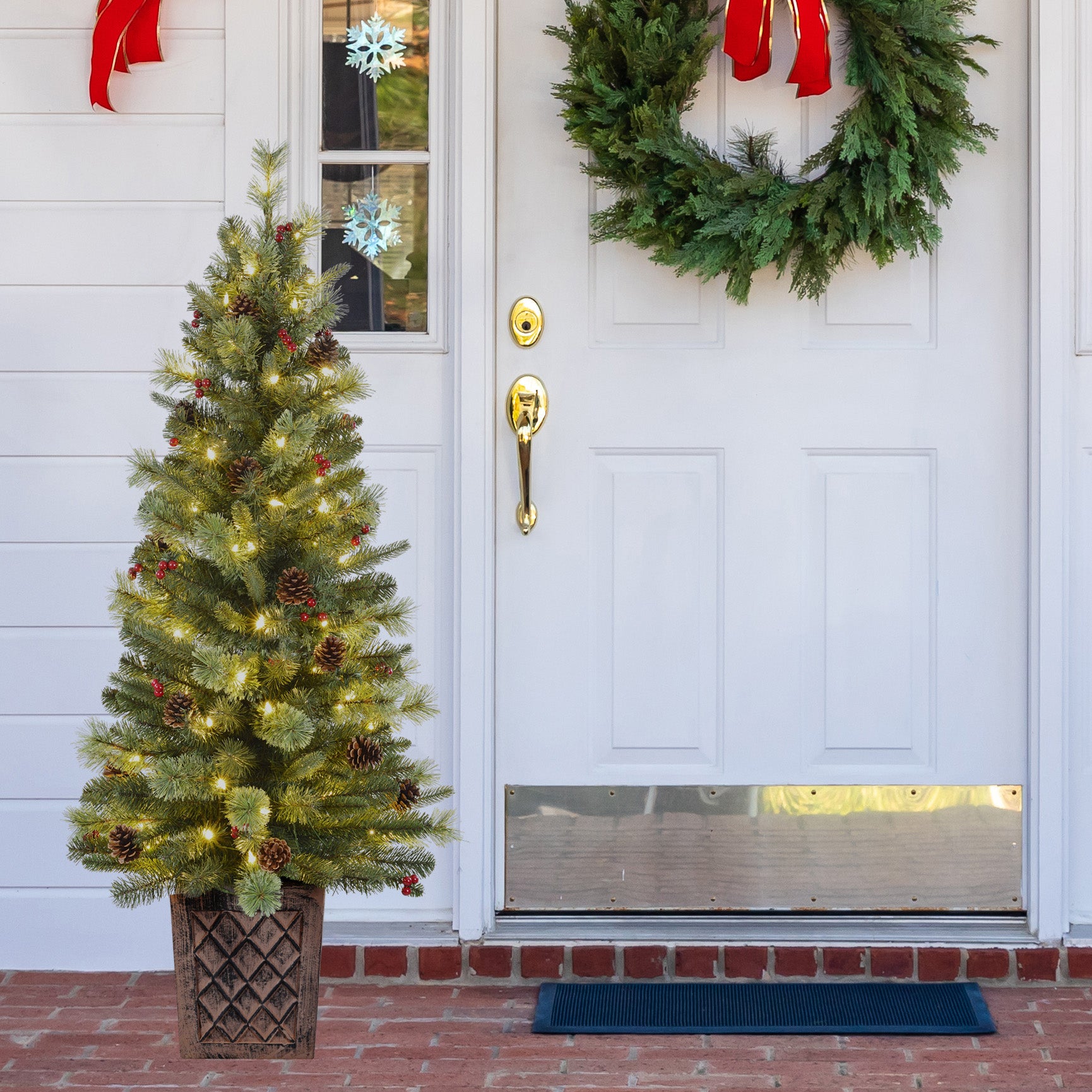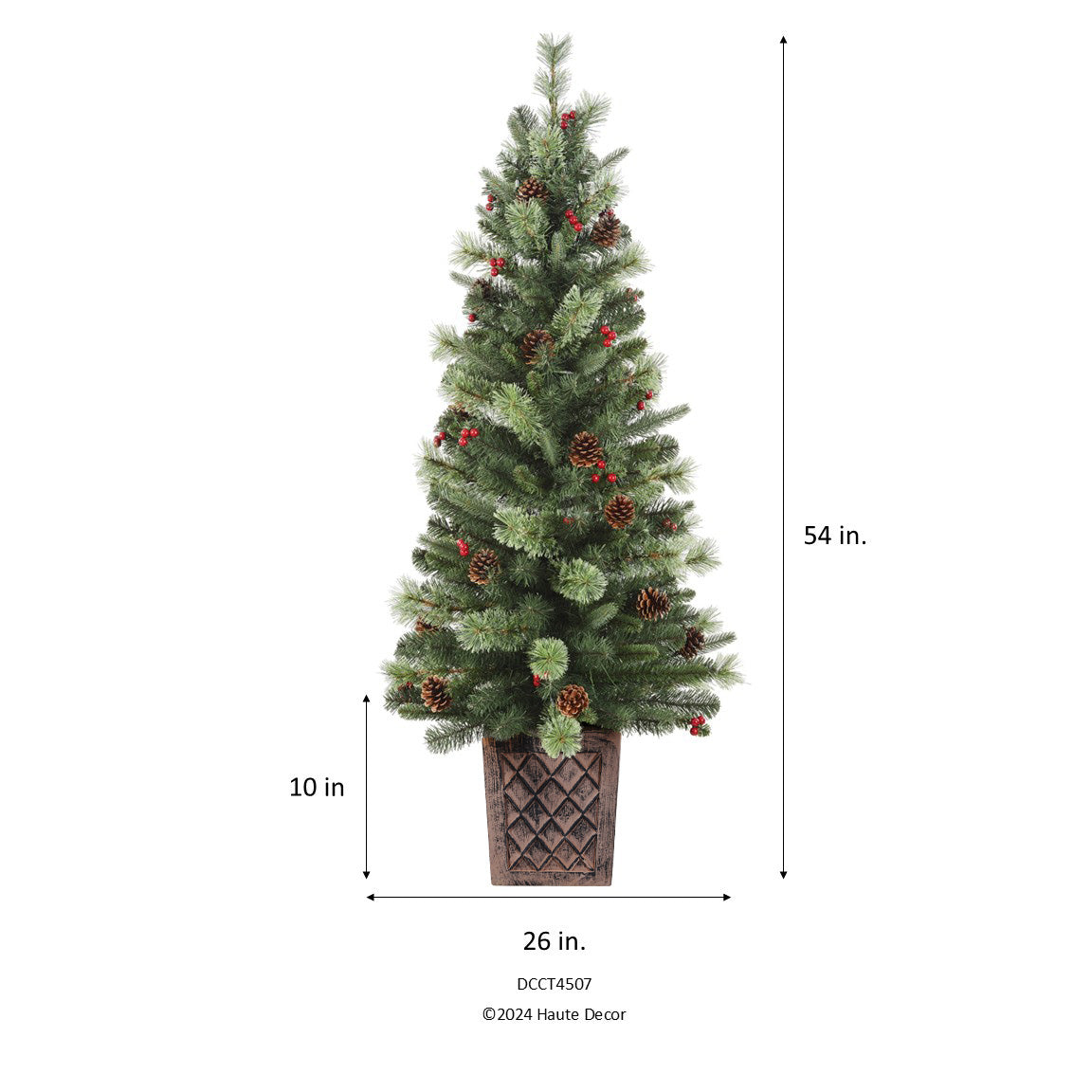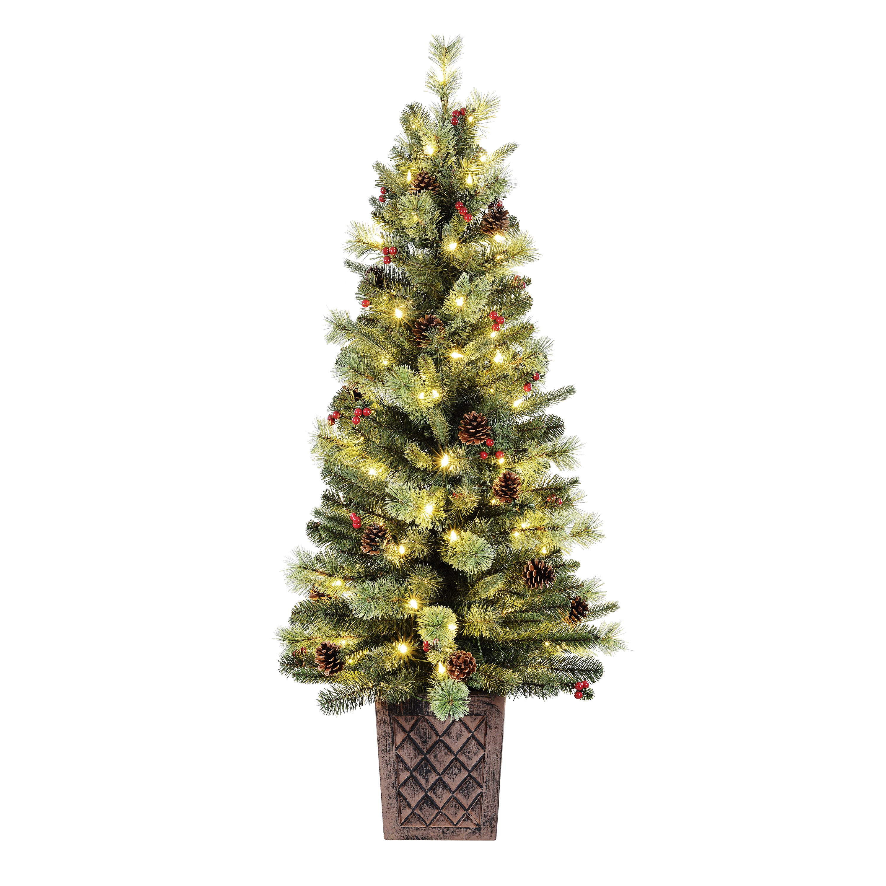 This 4.5 foot tall potted Christmas tree has a beautiful blend of faux fir PVC greenery, cashmere tips, weather-safe red berries, and real pinecones. Suited for indoor or outdoor use, this is a perfect porch Christmas tree. Flank two by the front door, entryway, or fireplace for a regal look or, tuck one in the corner to complete your holiday decor. Pre-strung with 100 warm white LED lights that give off a warm glow. A heavy brown resin planter adds a modern look to this classic Christmas porch tree. For outdoor or indoor use.