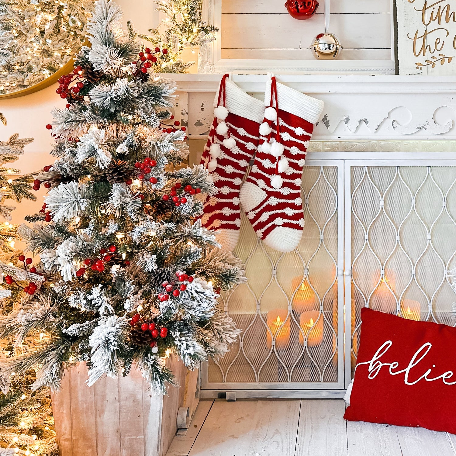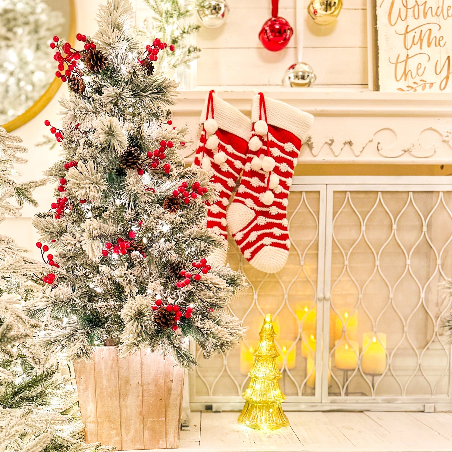 The artificial PE/PVC Ashcroft potted Christmas tree will make the perfect addition to any wintery decor theme. The shape and height of the tree provide versatility that allows you to place it in many areas of the home including by the interior front door, foyer, or tucked in a corner! The Ashcroft potted tree features 202 PE/PVC frosted round and pointed cone tips and faux red berries. It is beautifully lit with 100 warm white LED lights on an automatic timer. A white-wash wood base creates the perfect finishing touch. Constructed of realistic-looking, flame-retardant PE/PVC . Indoor use only. Measures 25-inch Diameter x 48 inches High; Wood base measures 11 inches High. Total weight is 15 lbs.