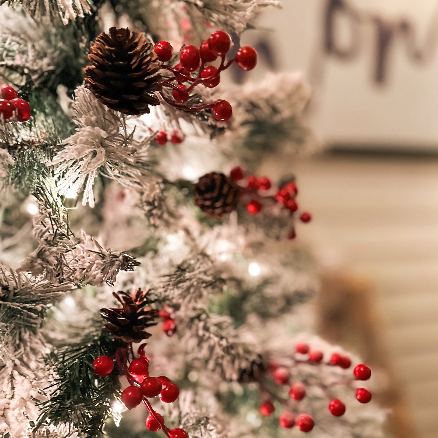 - Features 202 PE/PVC frosted round and pointed cone tips and faux red berries.