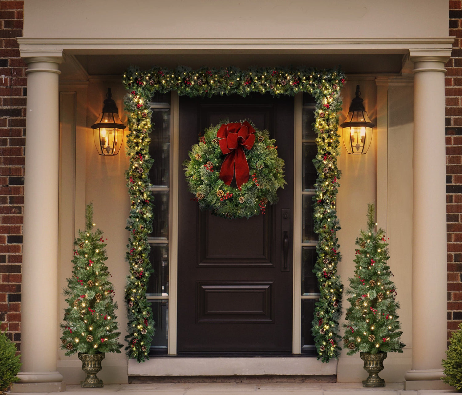 A beautiful blend of faux fir PVC greenery, cashmere tips, weather-safe red berries, and real pinecones is suited for indoor or outdoor use. Flank two by the front door, entryway, or fireplace for a regal look or, tuck one in the corner to complete the look. Pre-strung with 80 warm white LED lights that include a built-in timer that runs 6 hours on and 18 hours off. A stone-look resin urn finishes off this classic Christmas style porch tree. Simple assembly required. Requires 4 AA batteries, not included. Measures 18 inches diameter x 48 inches high.