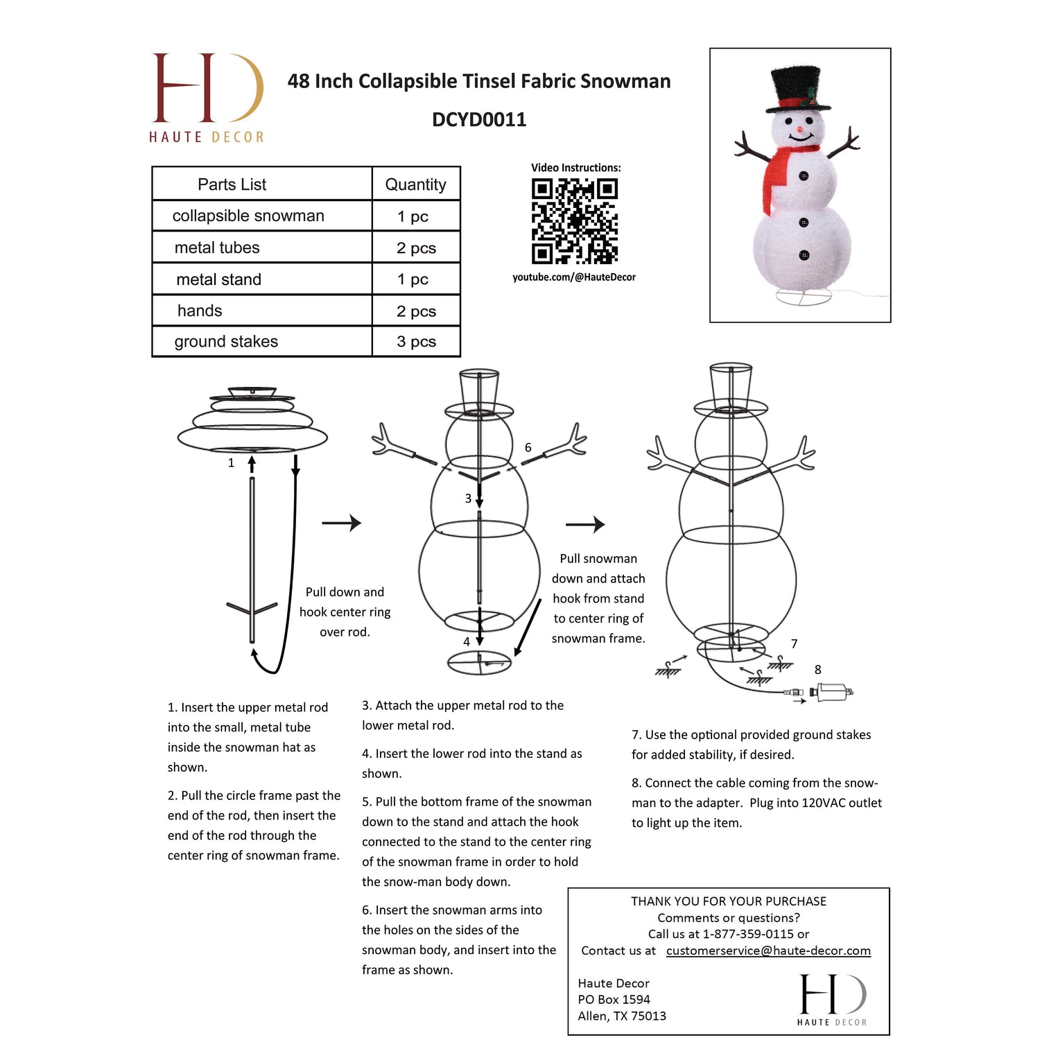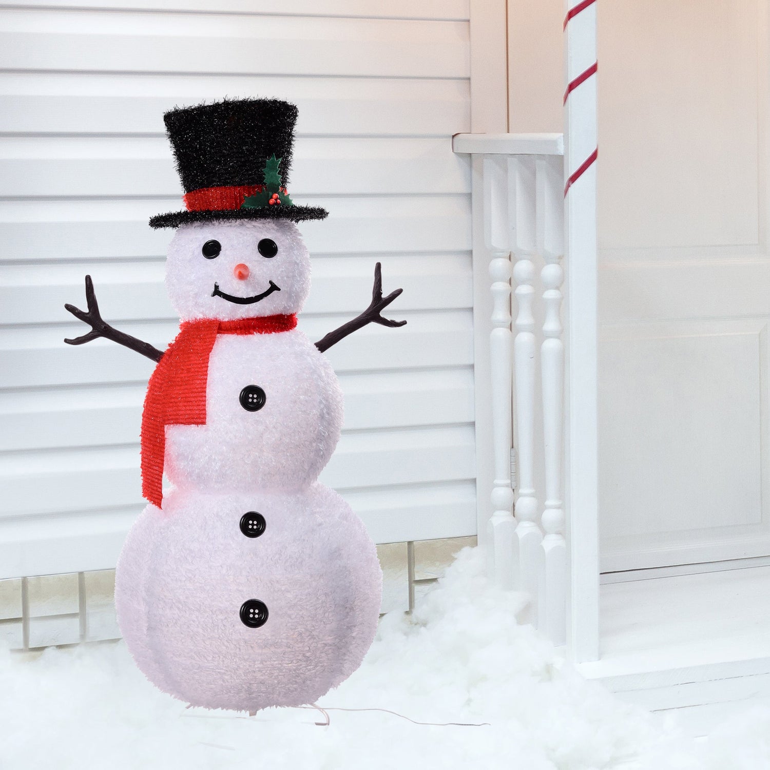 Welcome guests with this happy 4 foot tall snowman in his red scarf and black top hat with a holly sprig. He is made of white soft sparkly tinsel fabric with 50 LED energy-efficient lights on a wire frame body. It is a "pop-up" decoration that utilizes an accordion style design for quick and easy set up. When disassembled, it returns to its original flattened shape for easy, space-saving storage. A wonderful outdoor or indoor winter decoration!