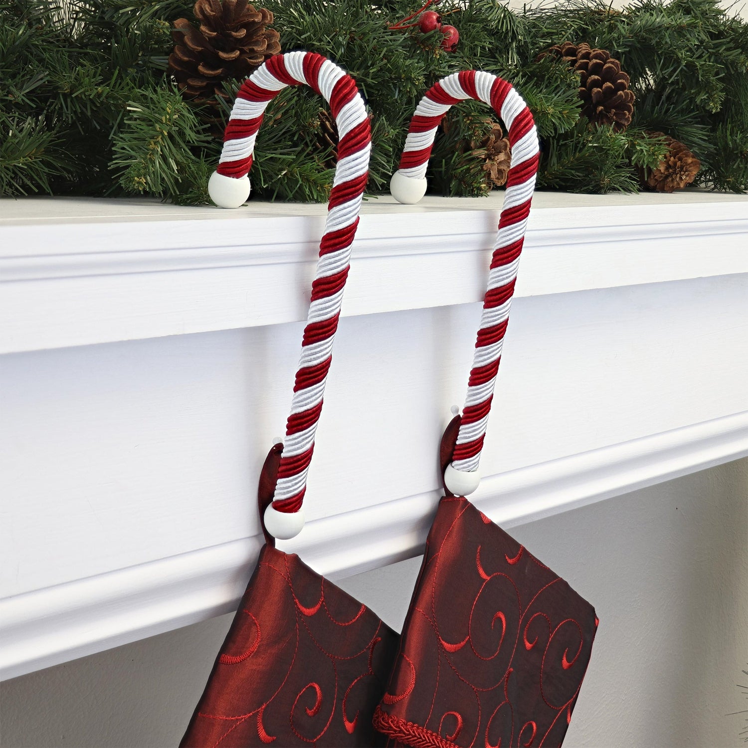 These adorable Candy Cane Stocking Holders feature a NEW larger colorful twist on Stocking Holders! Big bold traditional candy cane designed stocking holders will make a beautiful addition to any mantel design for the holidays. The patented lightweight design has a solid steel core and gripping rubber ends which gives these holders the ability to hold a full, 10-lb stocking. These features make these stocking holders safer than heavy, counter-balance alternatives. The patented design lets the holder swivel once hung, allowing them to fit almost any size or shape of mantel. NOTE - For some mantels, stockings need to be hung from Candy Cane Stocking Holders to keep them upright. Fits almost any sized mantel.