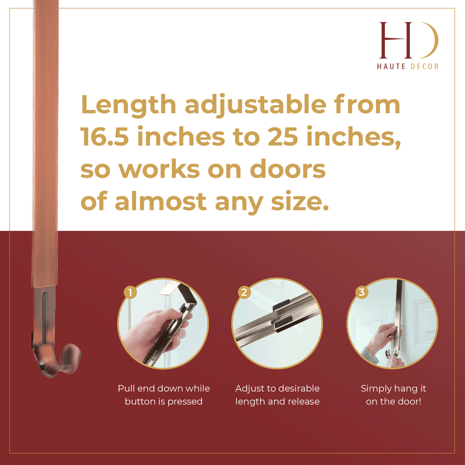 Everyone knows the best part of any holiday is getting to decorate. Take your holiday decorations to the next level with Haute Decor Adjustable Wreath Hanger. This gorgeous wreath hanger is high-quality and designed to withstand the elements, so you can hang your heavy wreaths and decorations (up to 20lbs). Works perfectly with your Christmas wreath, Easter wreath, Halloween wreath...even your Boxing Day wreath! No matter the season, no matter the holiday, this wreath hook is the perfect way to display your impeccable style.