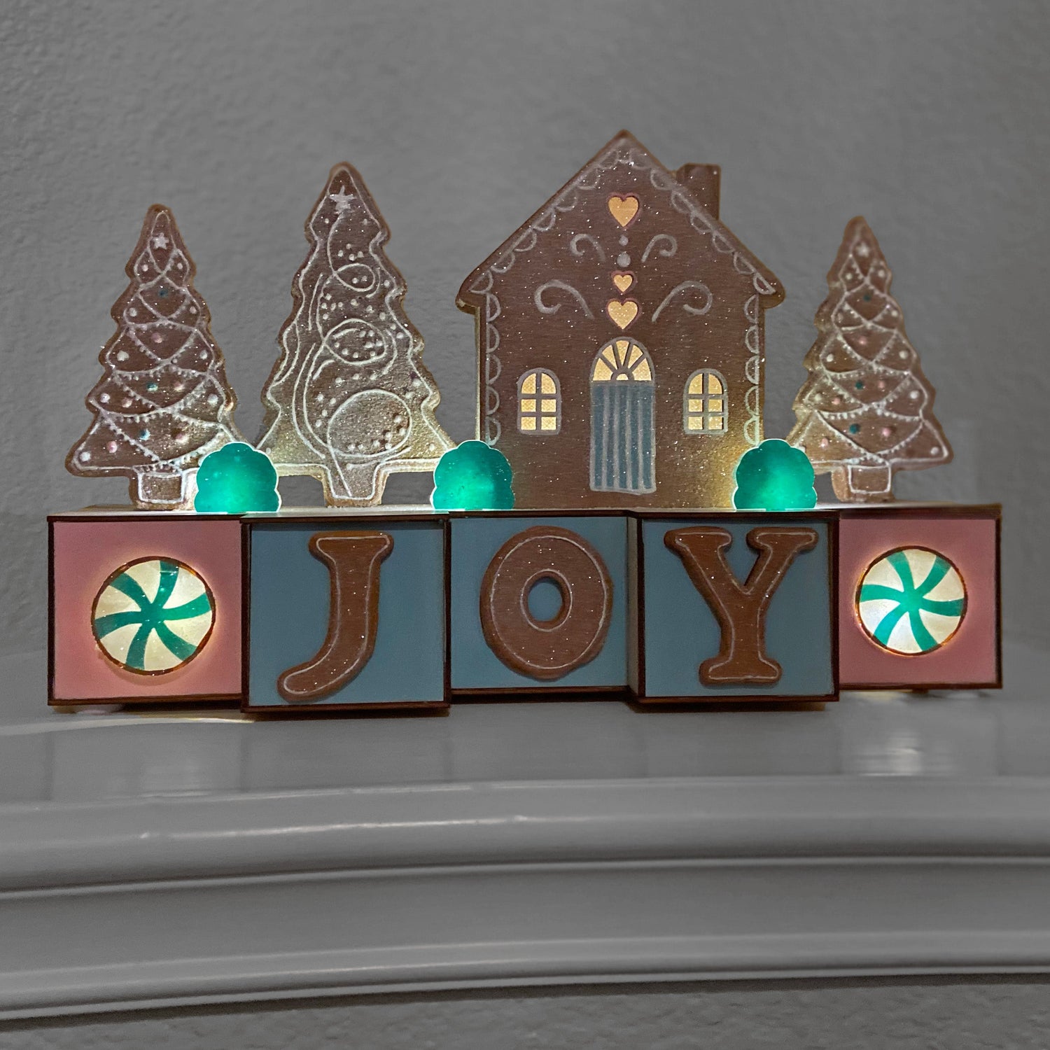 Add a touch of whimsy to your Christmas decor with these soft pastel gingerbread theme wood Christmas blocks featuring a gingerbread house and trees, accented with illuminated green gumdrops! Each block is made from MDF wood and is decorated with festive wood JOY lettering and peppermint candies, and lit with 8 warm-white LED lights. Battery operated with a built-in timer function that runs 5 hours on and 19 hours off. Indoor use only. Measures 15 inches Long x 4 inches Deep x 9.5 inches High.